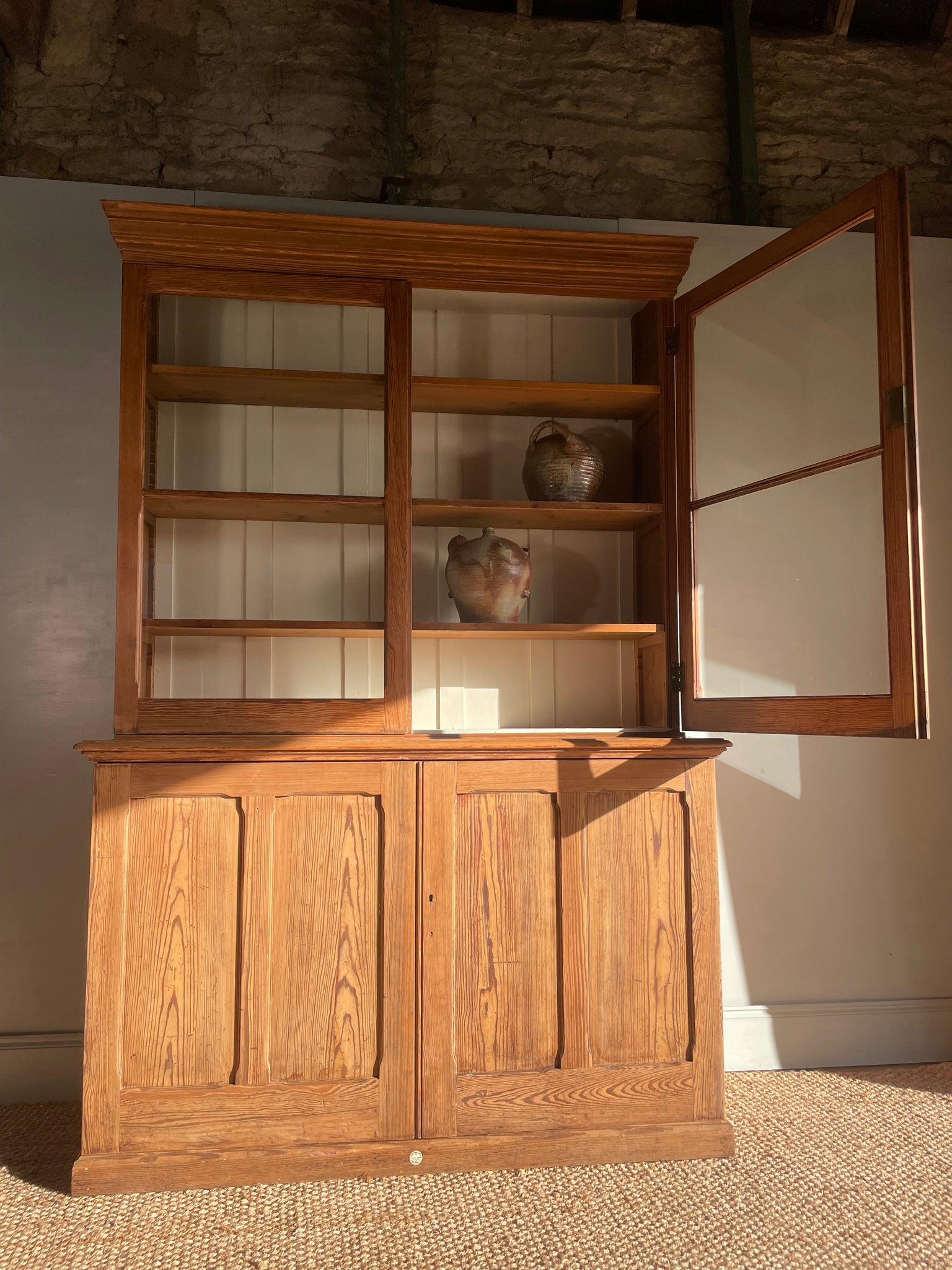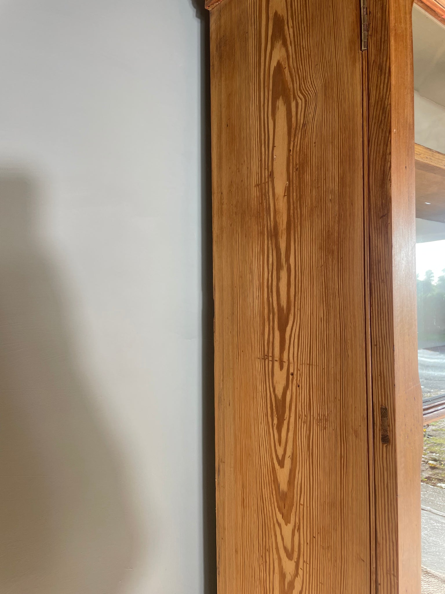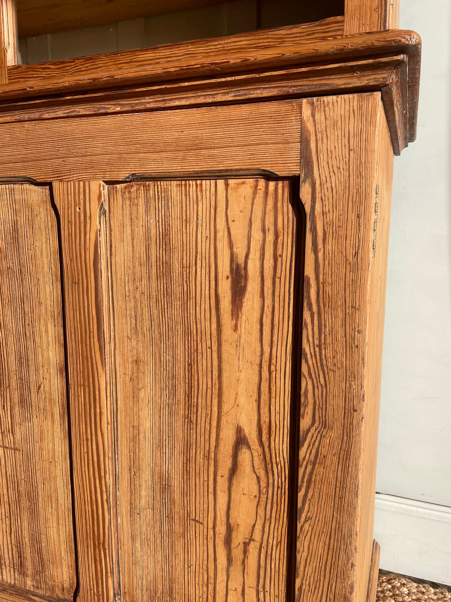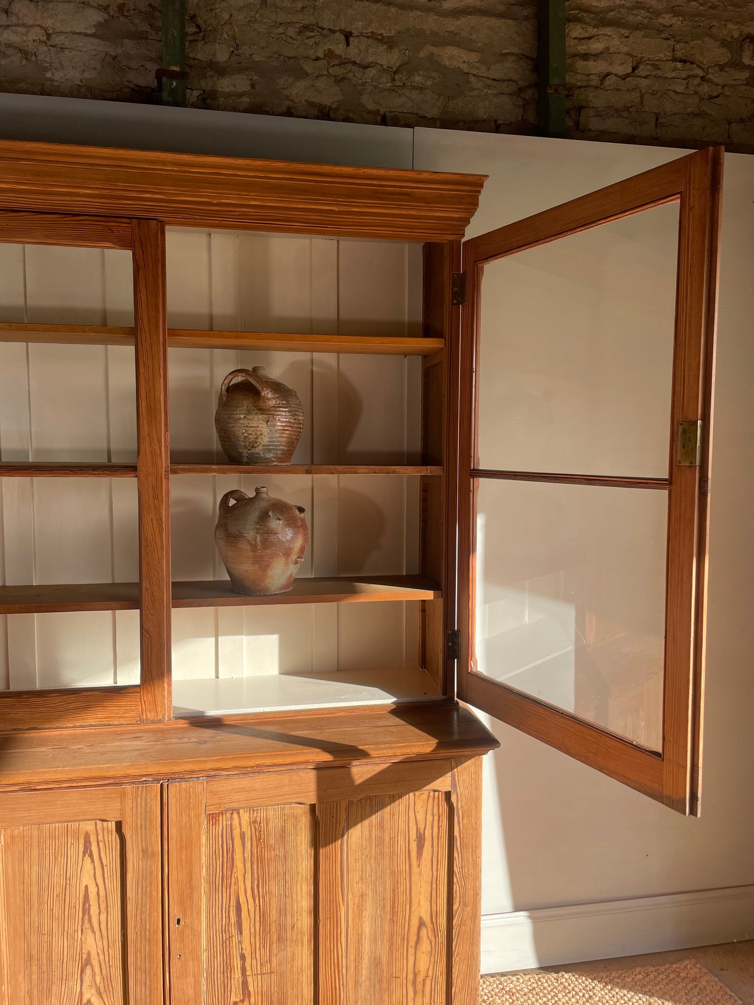 Stunning pitched pine old school cabinet, it’s been stripped back and now it’s looking beautiful and ready for its new home. It’s gone some signs of wear commensurate with age and a few scratches on the glass but you don’t really notice them once you put things in it, and that’s all part of the added charm. Please see photos for reference. A generous size it will be a good work horse in a kitchen pantry or even a studio.