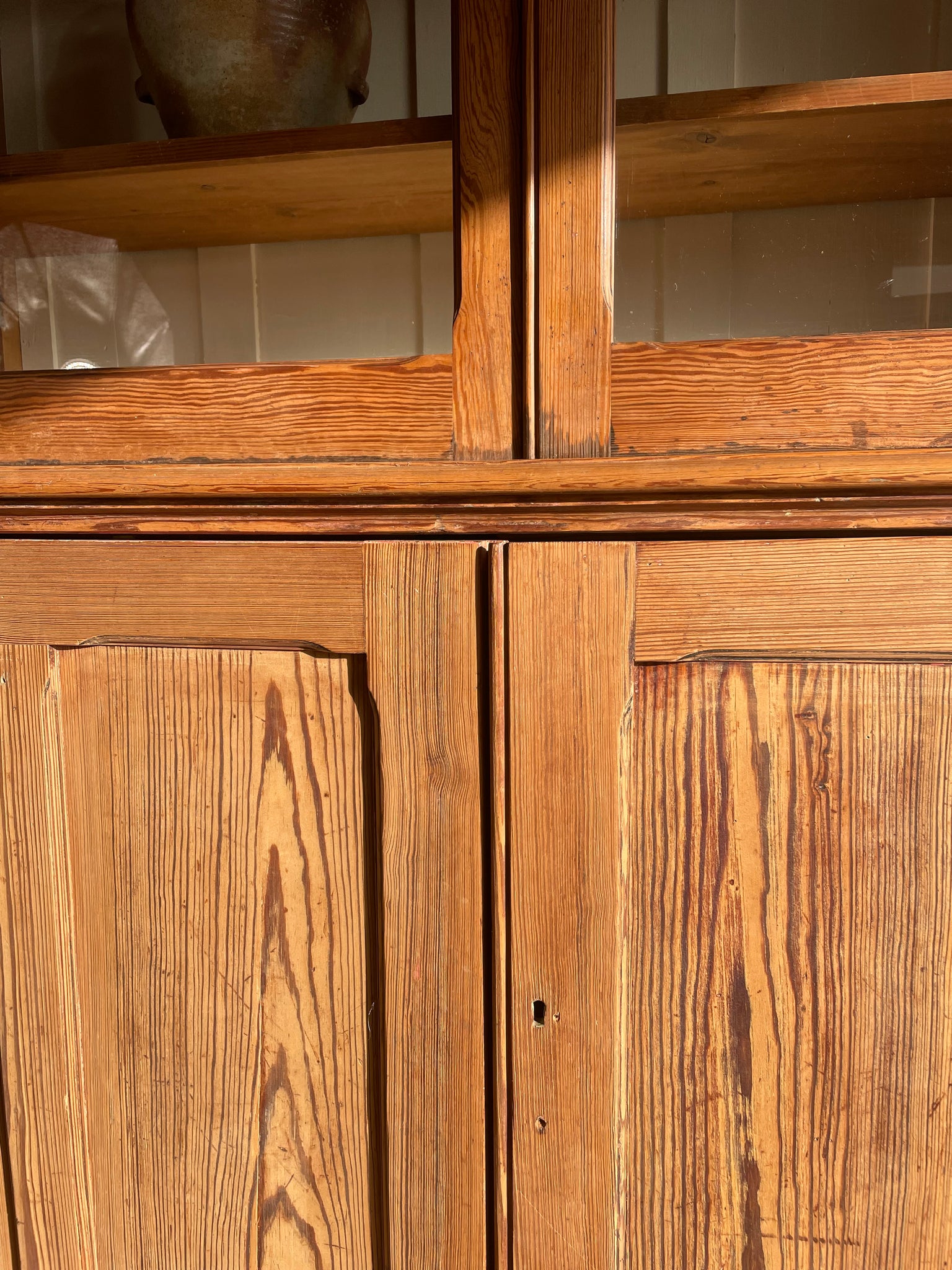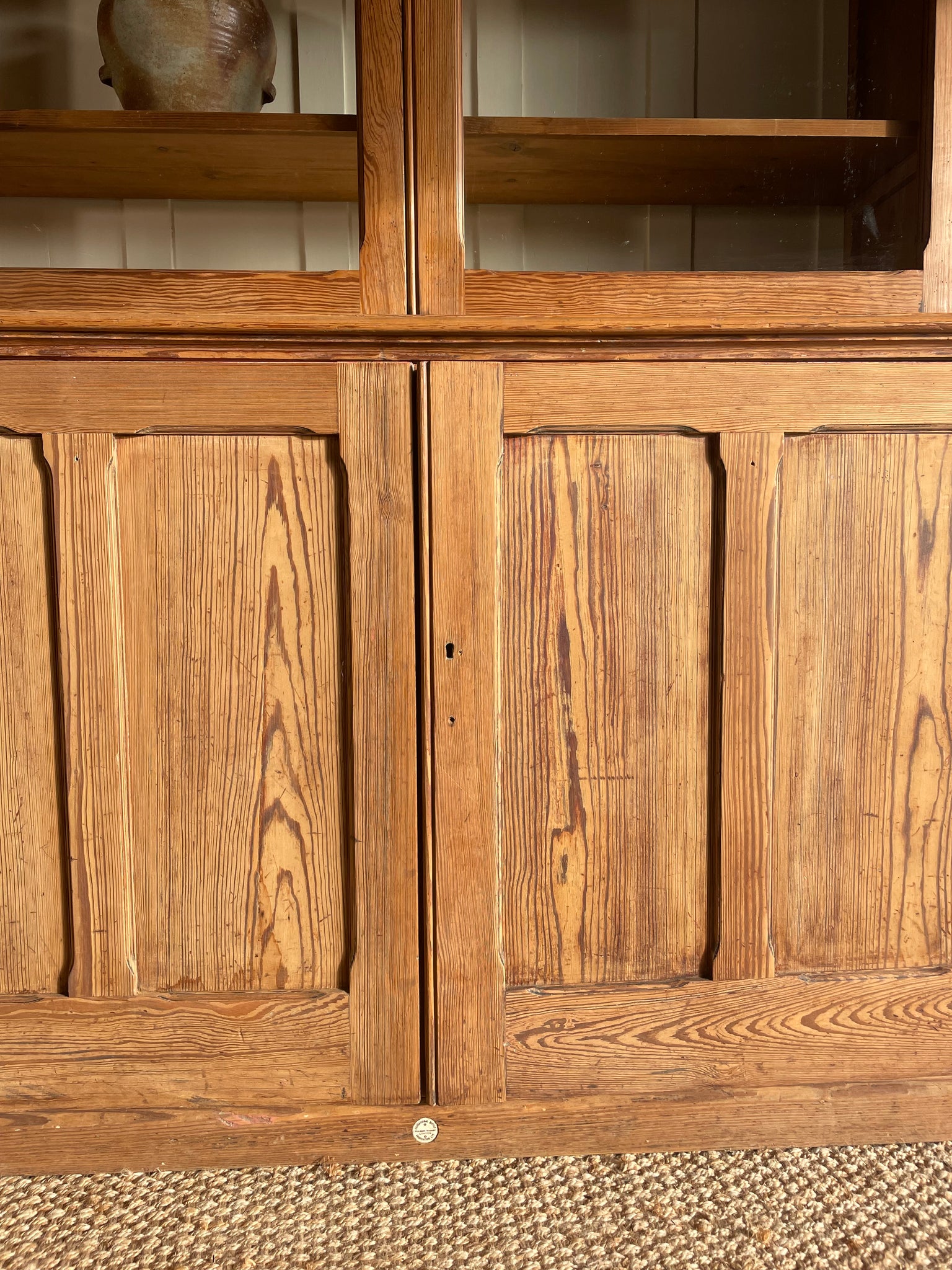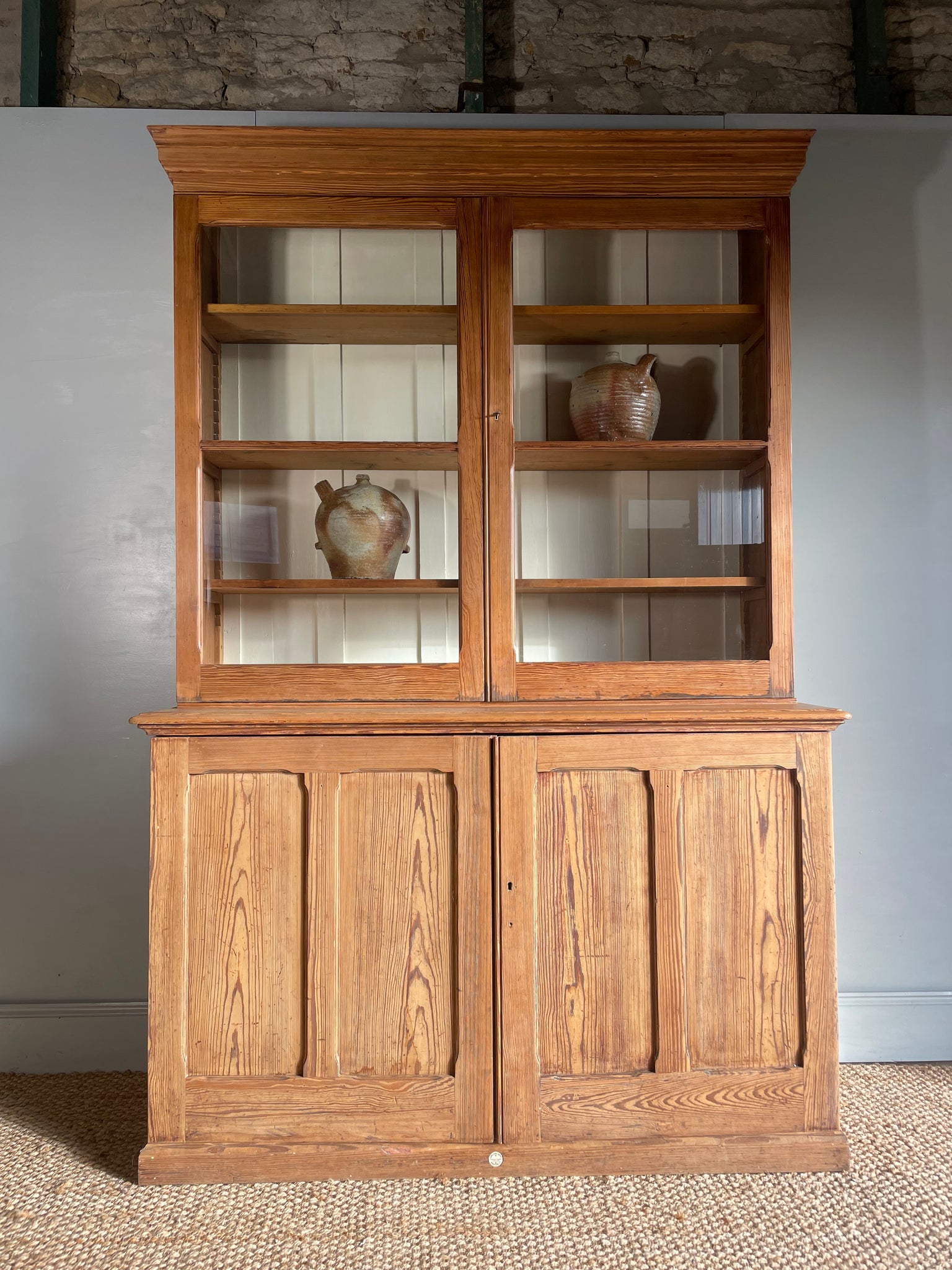 Stunning pitched pine old school cabinet, it’s been stripped back and now it’s looking beautiful and ready for its new home. It’s gone some signs of wear commensurate with age and a few scratches on the glass but you don’t really notice them once you put things in it, and that’s all part of the added charm. Please see photos for reference. A generous size it will be a good work horse in a kitchen pantry or even a studio.