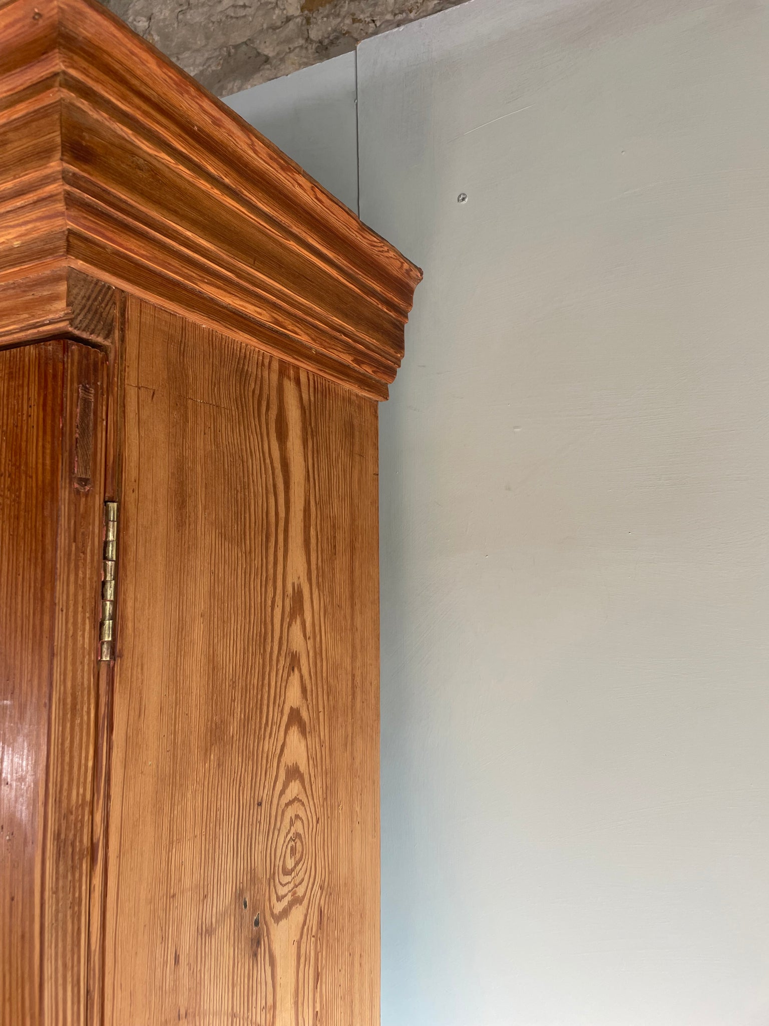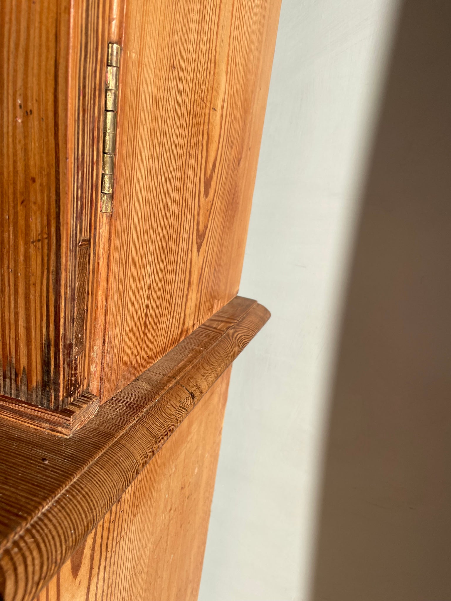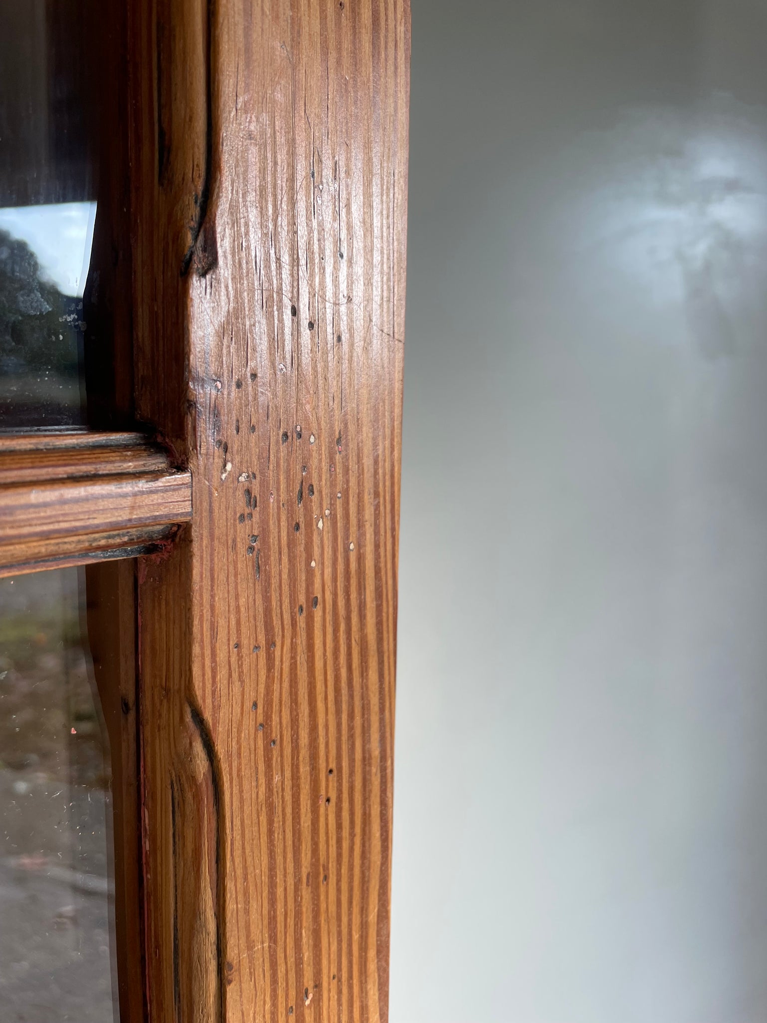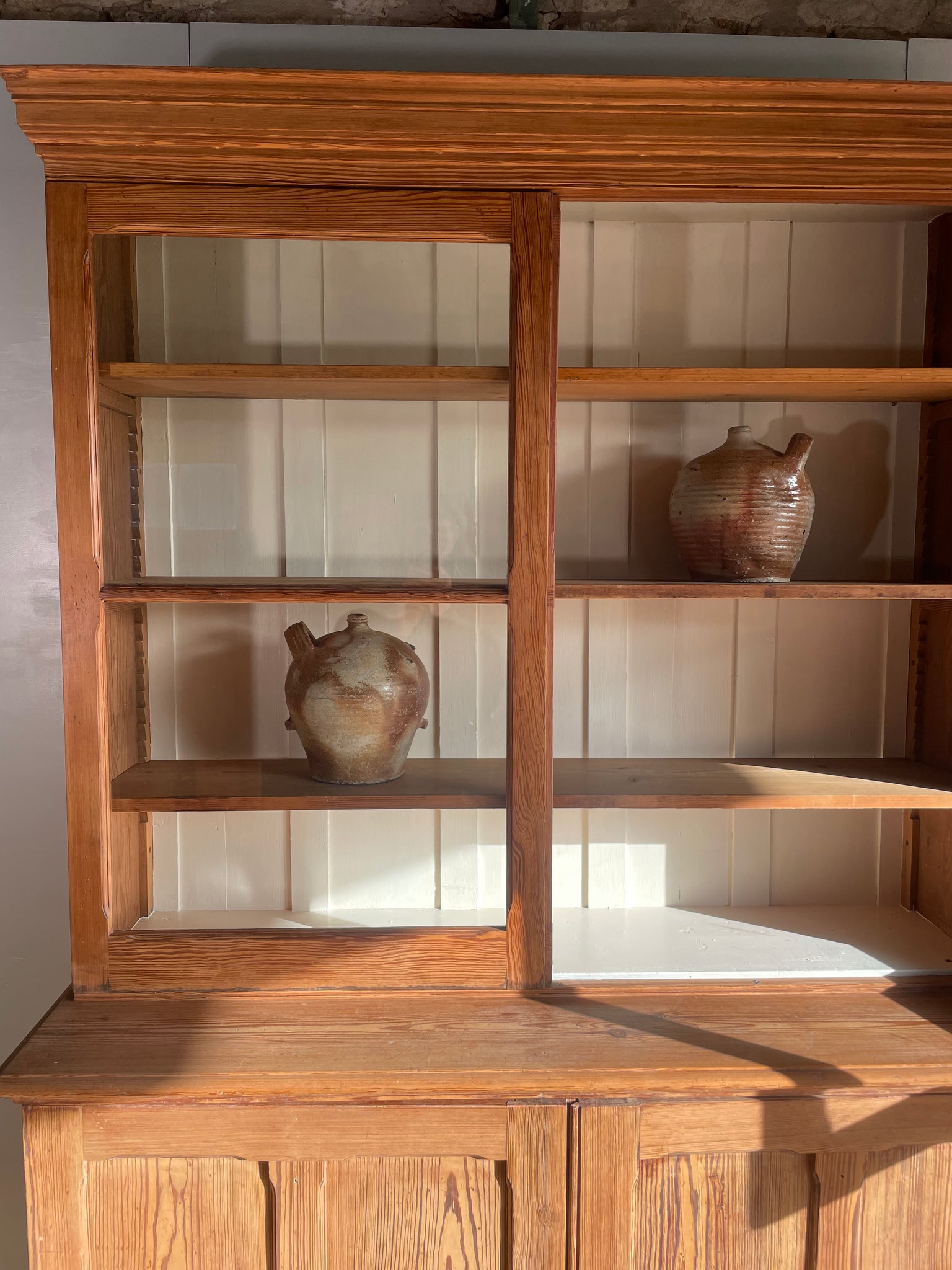 Stunning pitched pine old school cabinet, it’s been stripped back and now it’s looking beautiful and ready for its new home. It’s gone some signs of wear commensurate with age and a few scratches on the glass but you don’t really notice them once you put things in it, and that’s all part of the added charm. Please see photos for reference. A generous size it will be a good work horse in a kitchen pantry or even a studio.