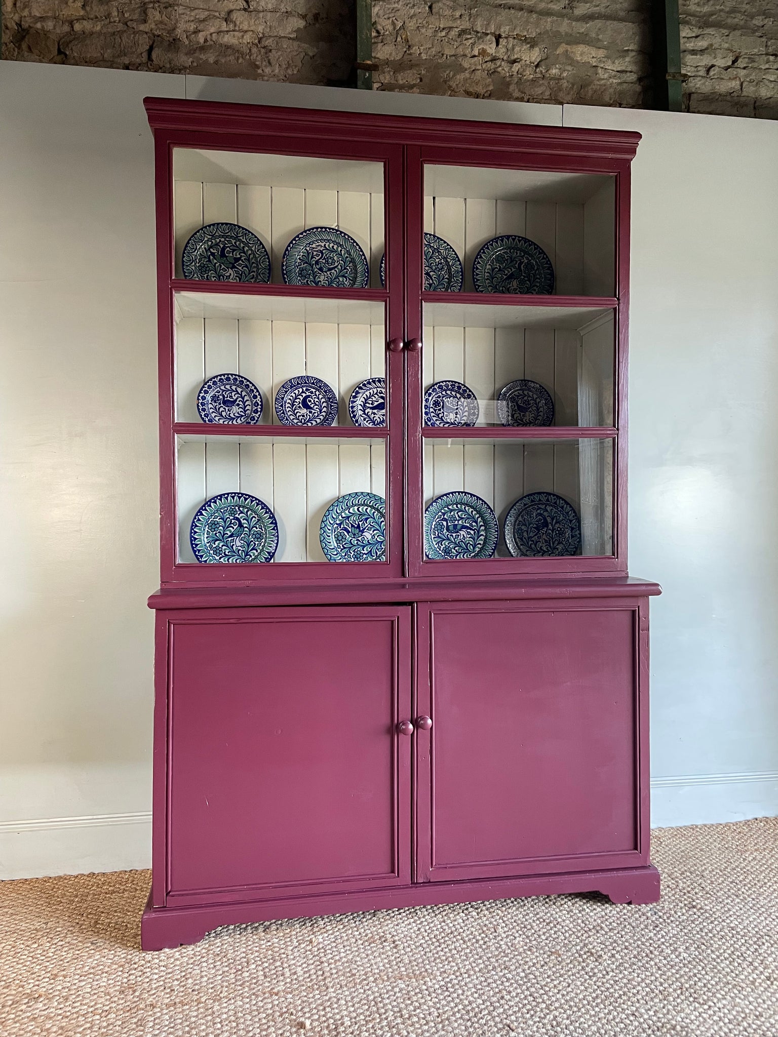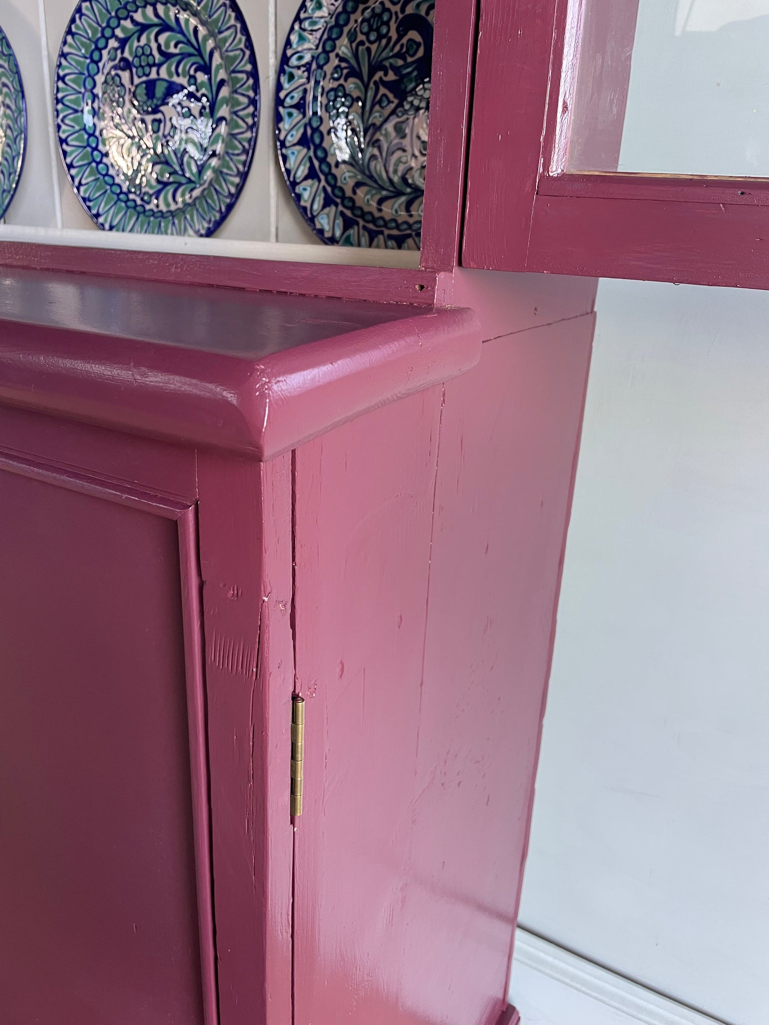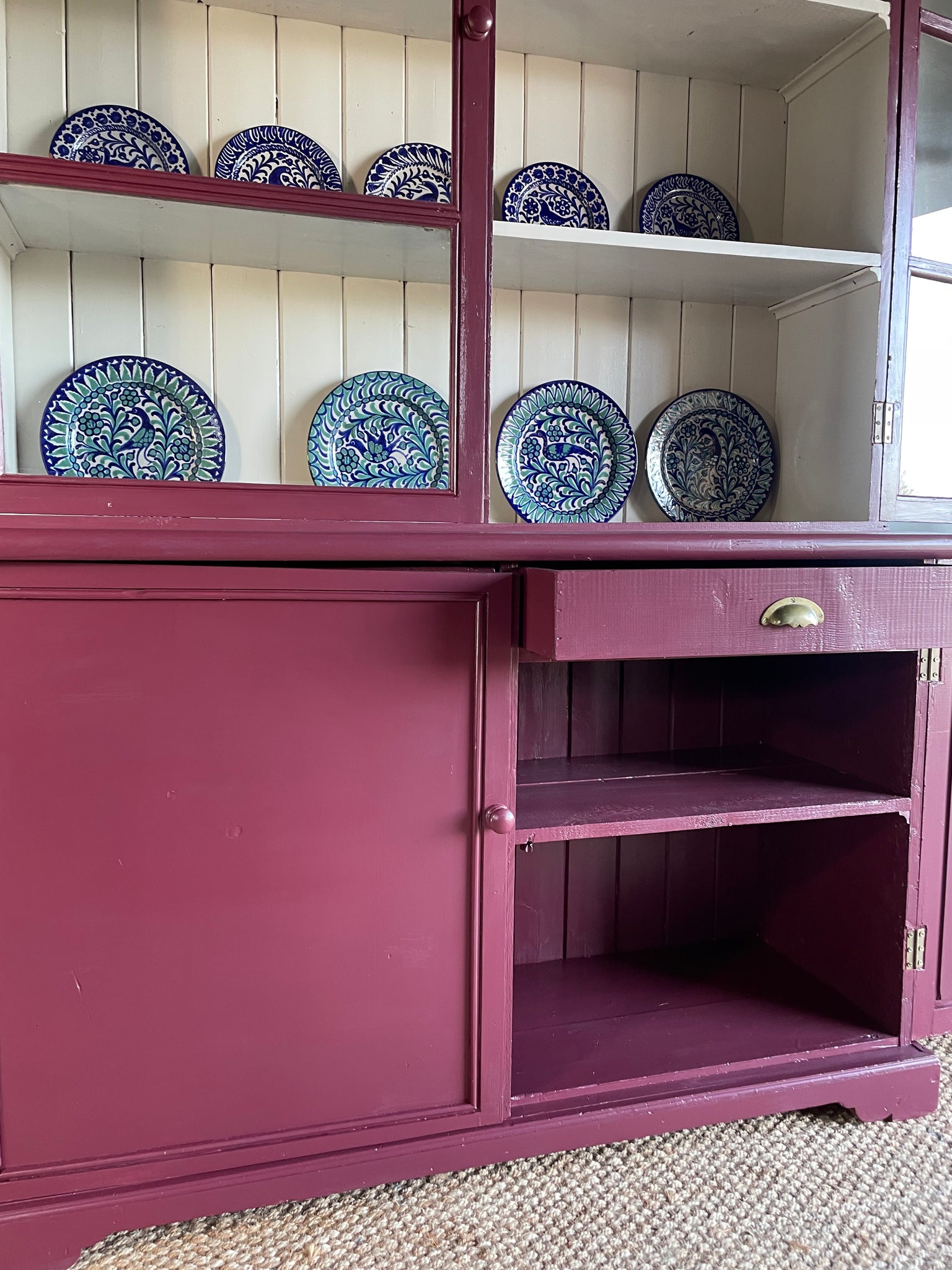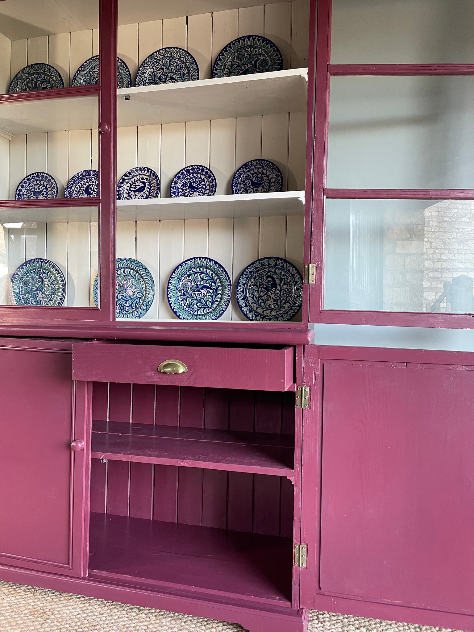 Antique pine dresser painted in Preference Red and Stirabout by Farrow and Ball, it’s a beautiful piece but it's worth noting it does have a bit of character the bottom left hand door - it shuts and opens fine however it's not straight at the top, and the knobs are a little unlevel, they aren't things you really notice unless you look for them. It's a piece which has lived a life and for a home that appreciates that sort of thing.