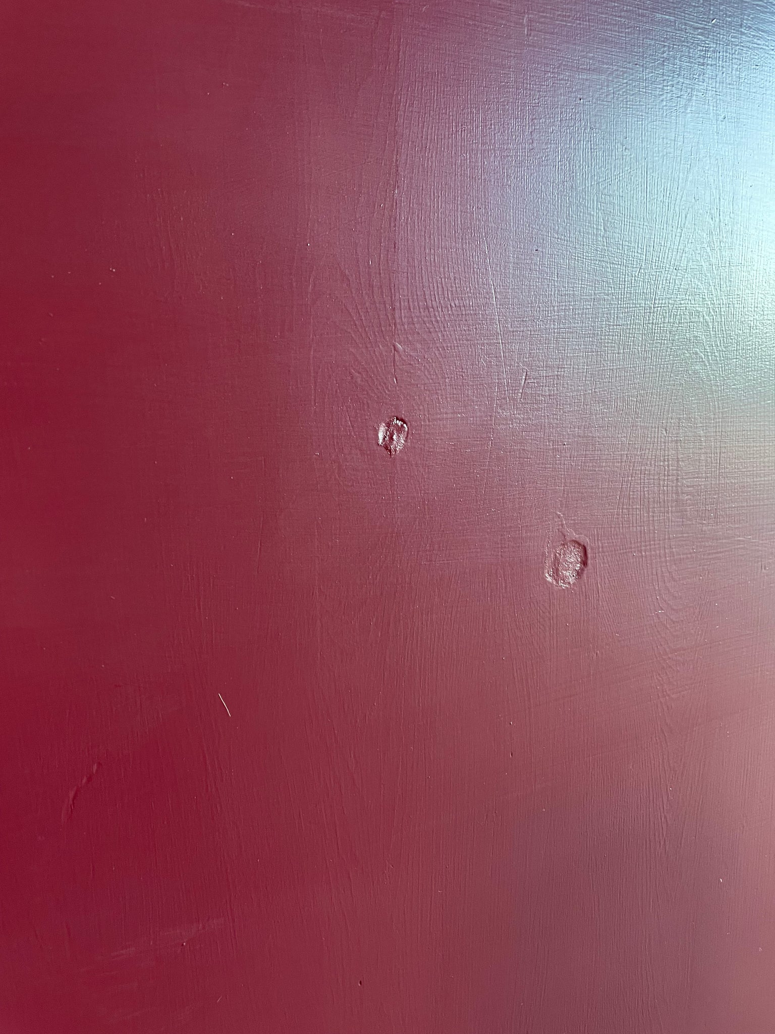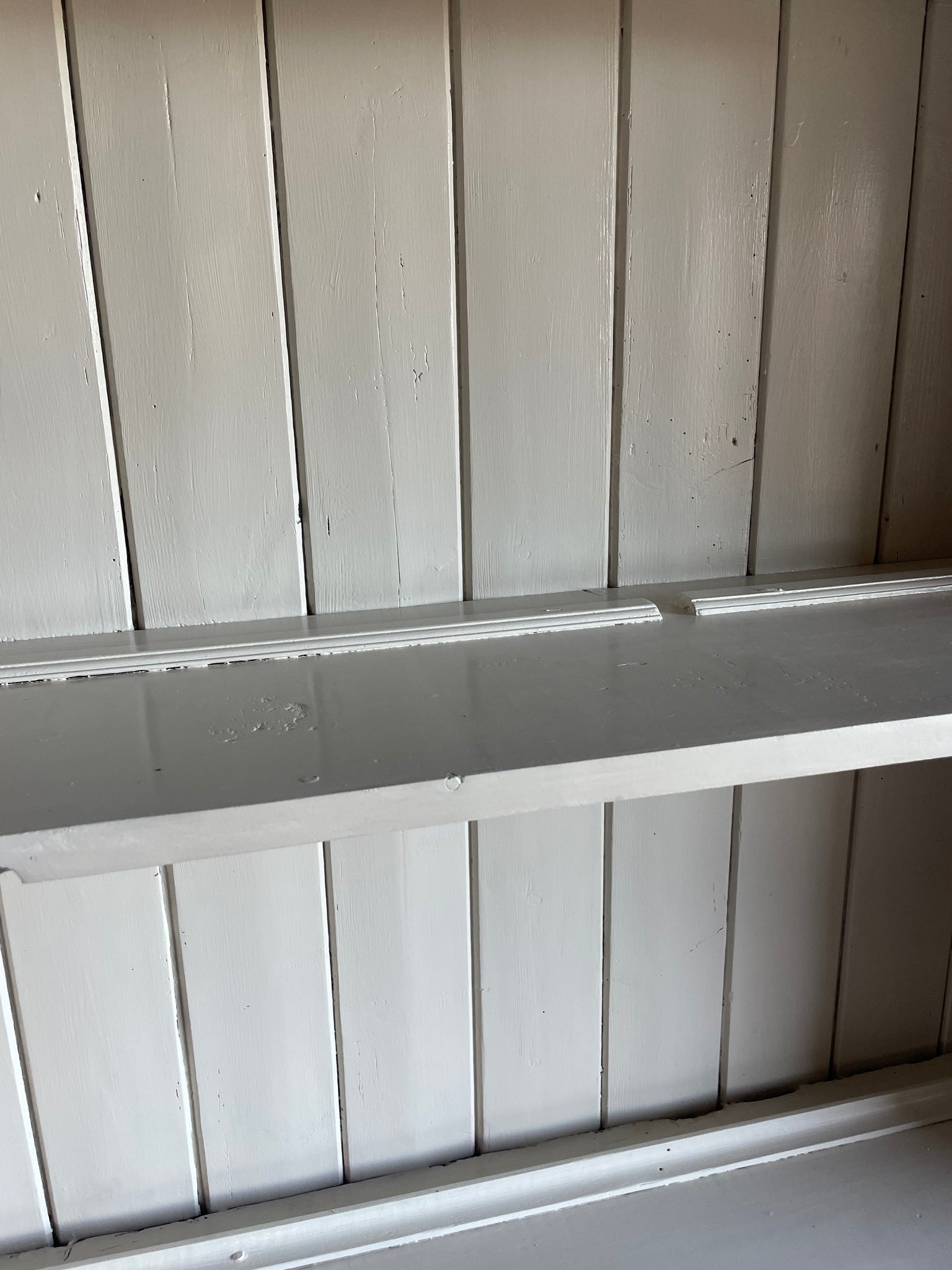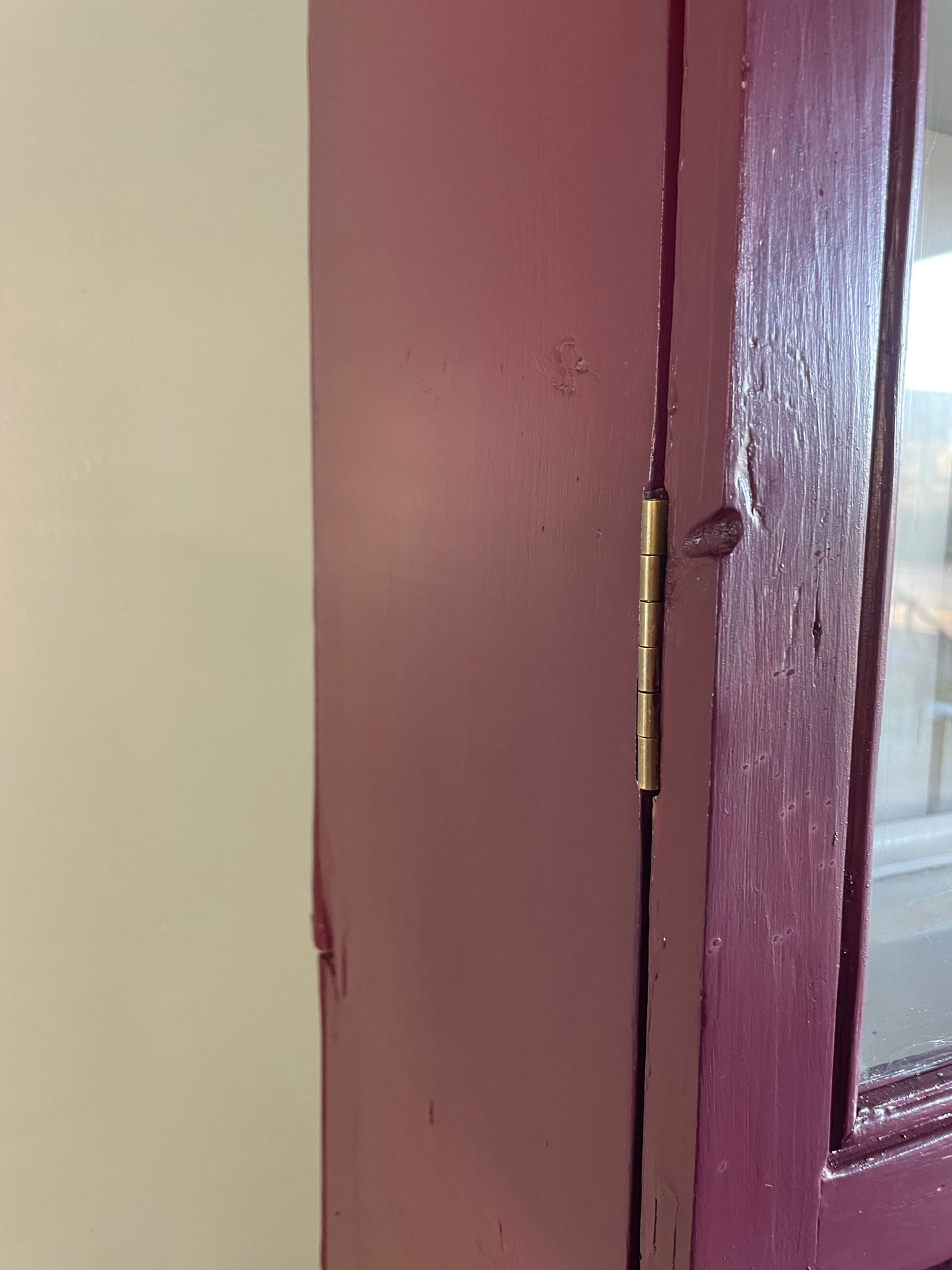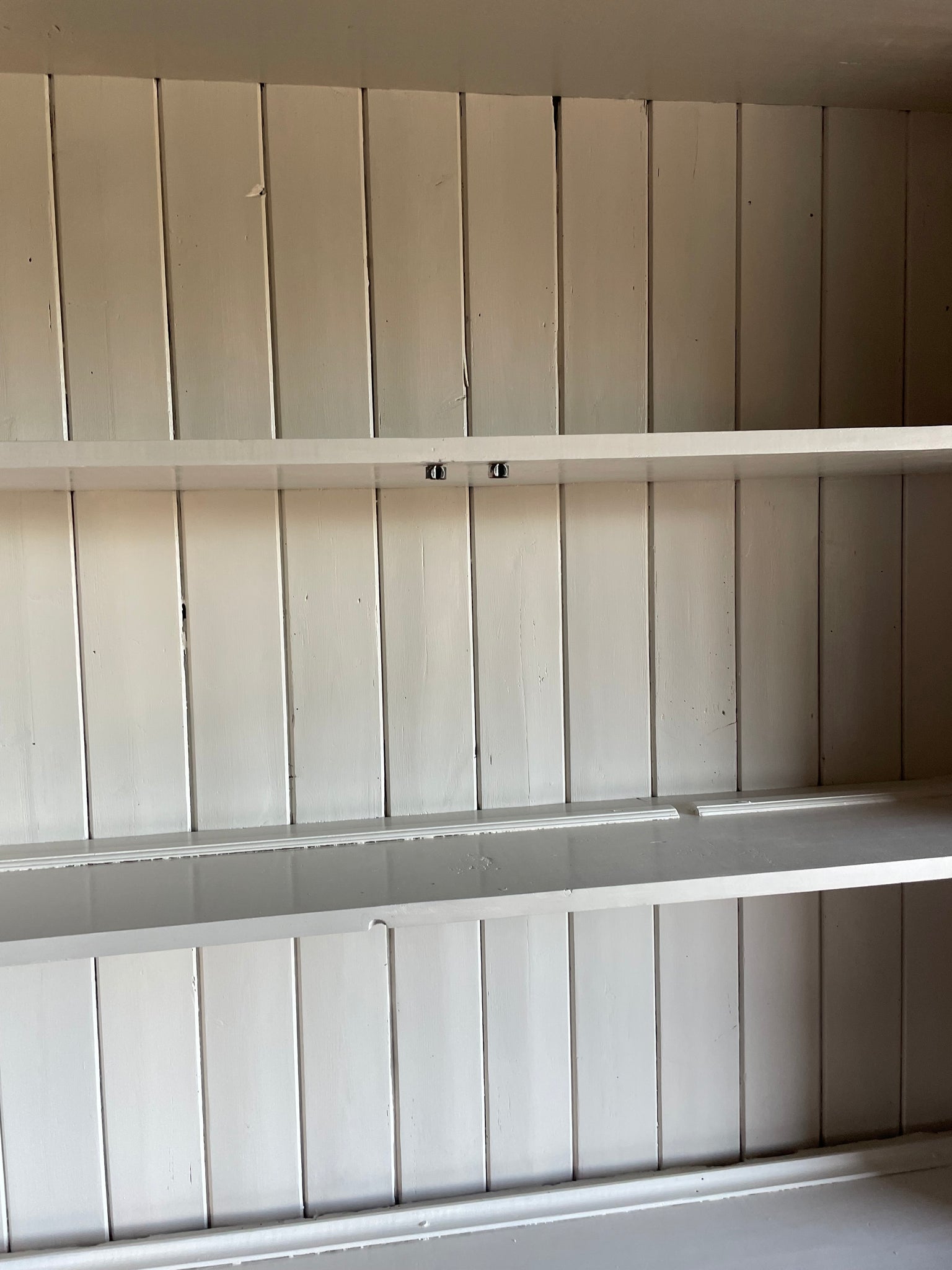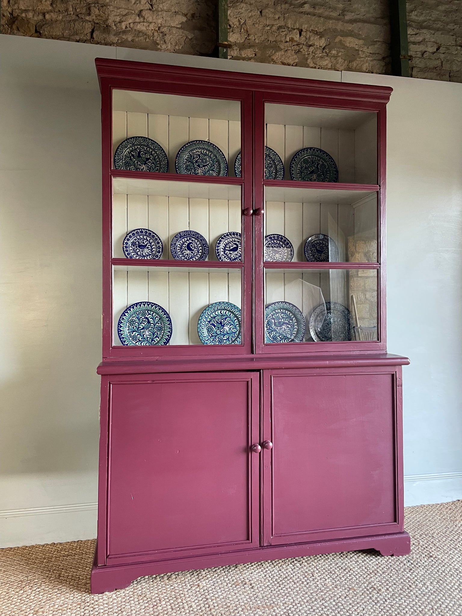Antique pine dresser painted in Preference Red and Stirabout by Farrow and Ball, it’s a beautiful piece but it's worth noting it does have a bit of character the bottom left hand door - it shuts and opens fine however it's not straight at the top, and the knobs are a little unlevel, they aren't things you really notice unless you look for them. It's a piece which has lived a life and for a home that appreciates that sort of thing.
