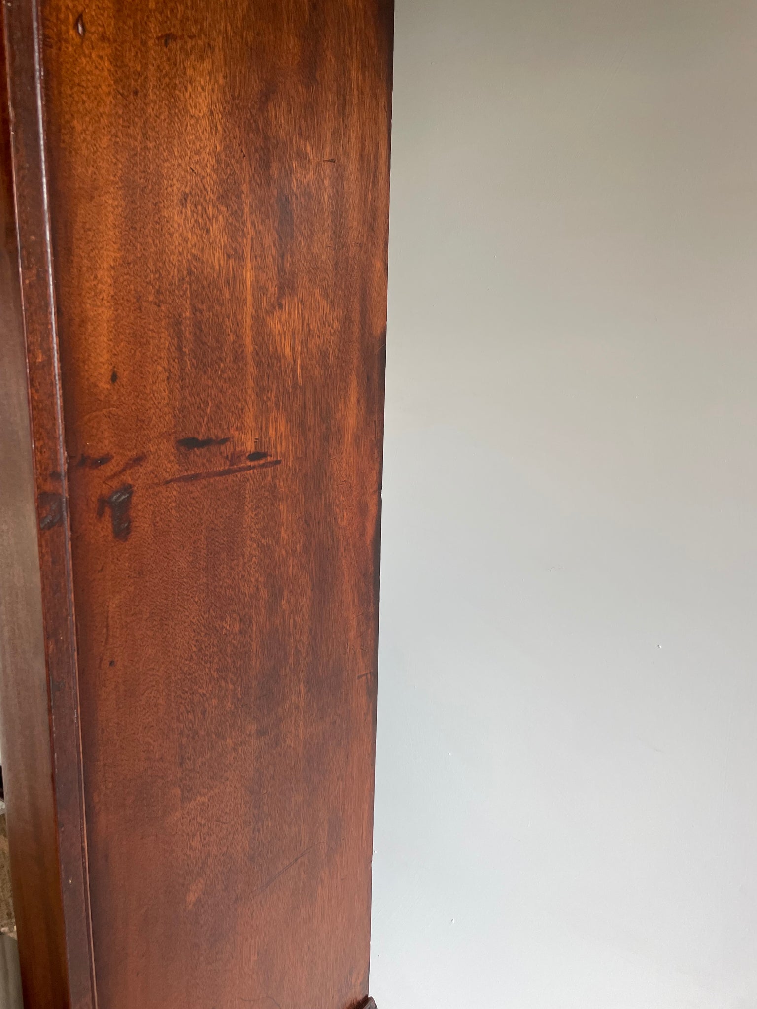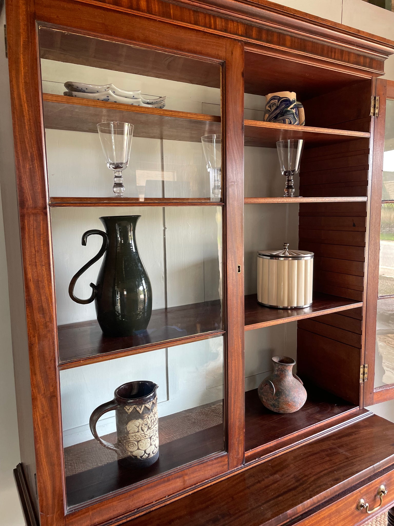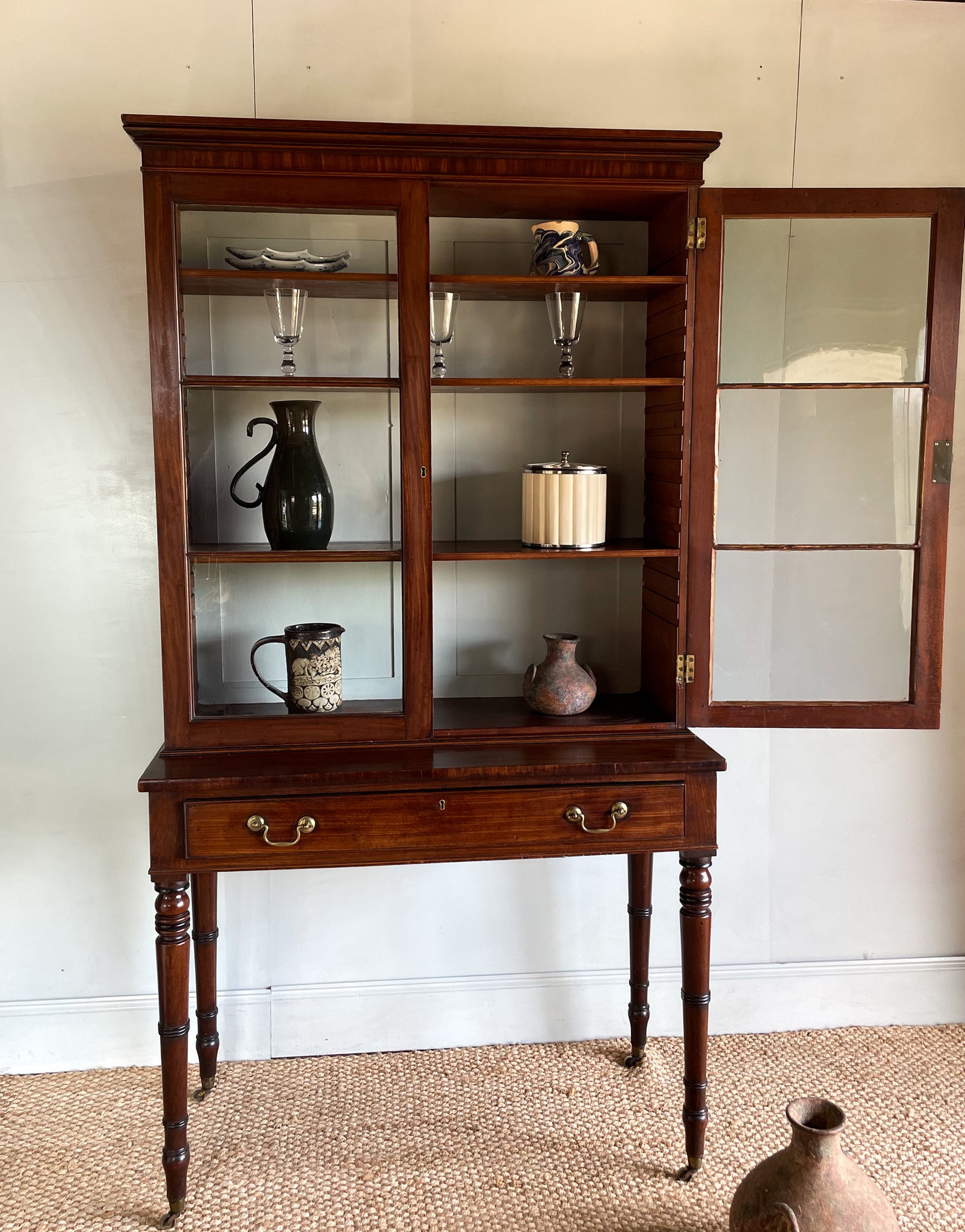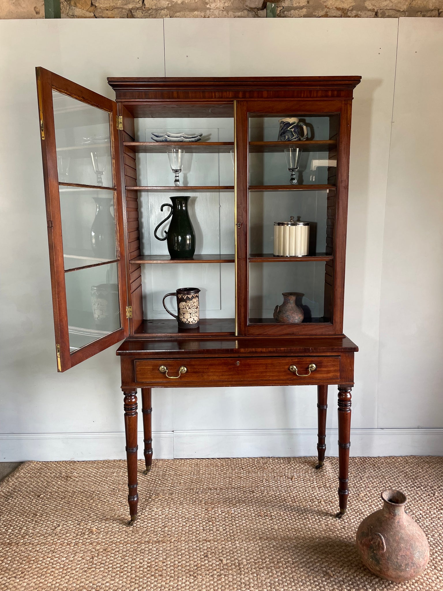Beautiful Regency glazed cabinet on turned legs. The inside back panel has been painted in Edward Bulmer's Welmish Blue so that any items inside the cabinet have a definitive shape and can be easily seen. Originally it would have been used as a bookcase with a writing desk platform when the drawer is opened. Today it would work well as; a drinks cabinet, glass cabinet, in a bathroom or for storing collectibles.