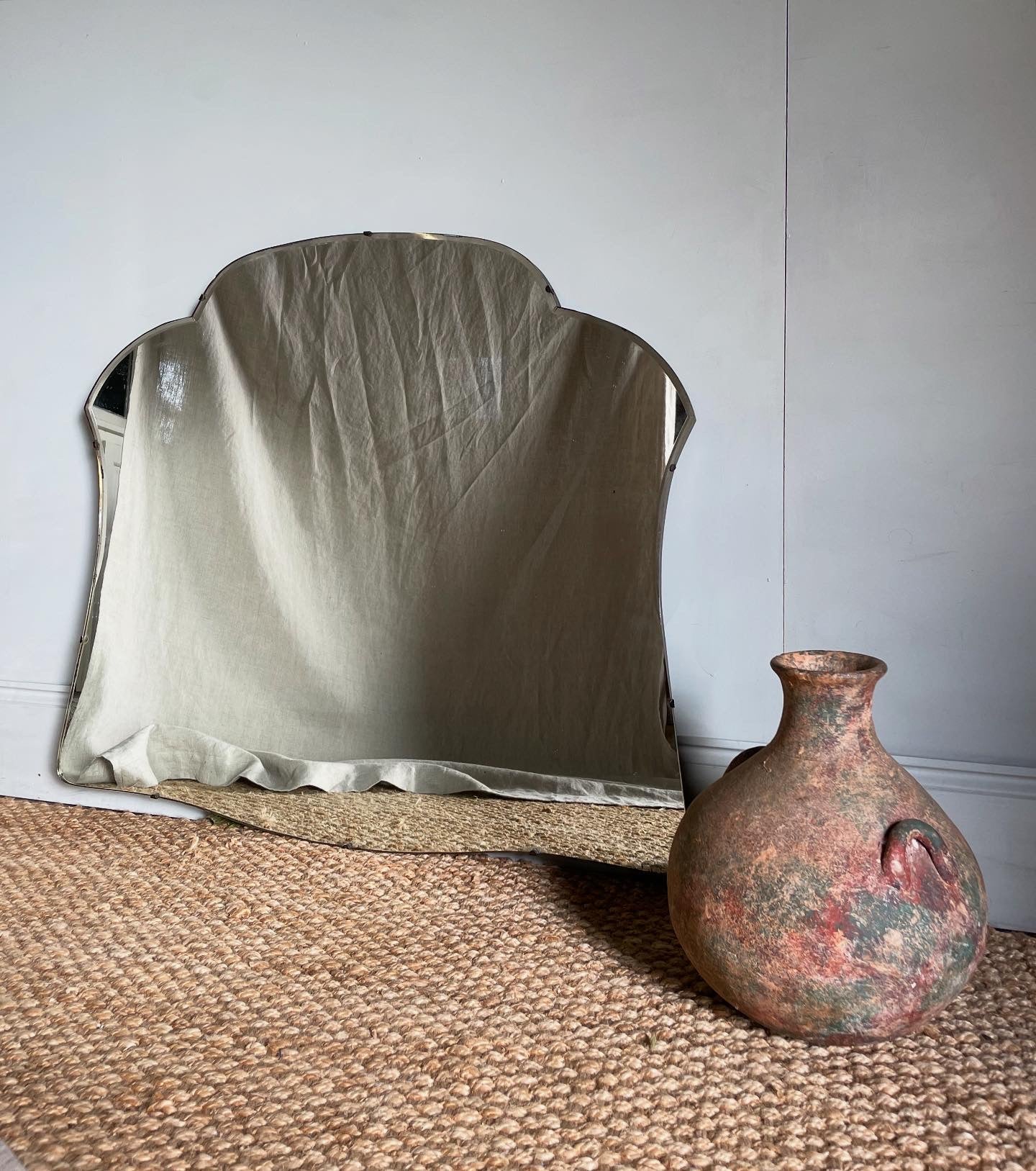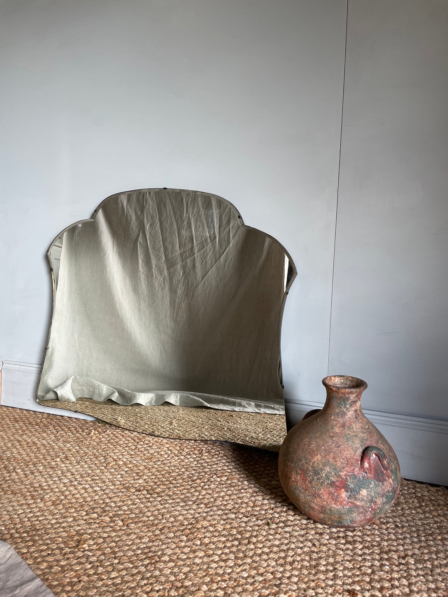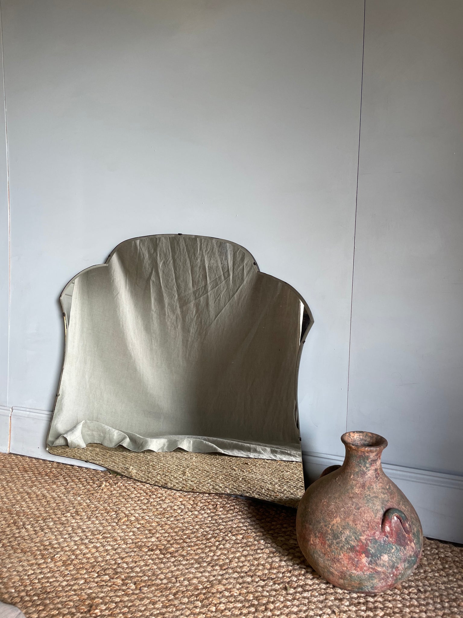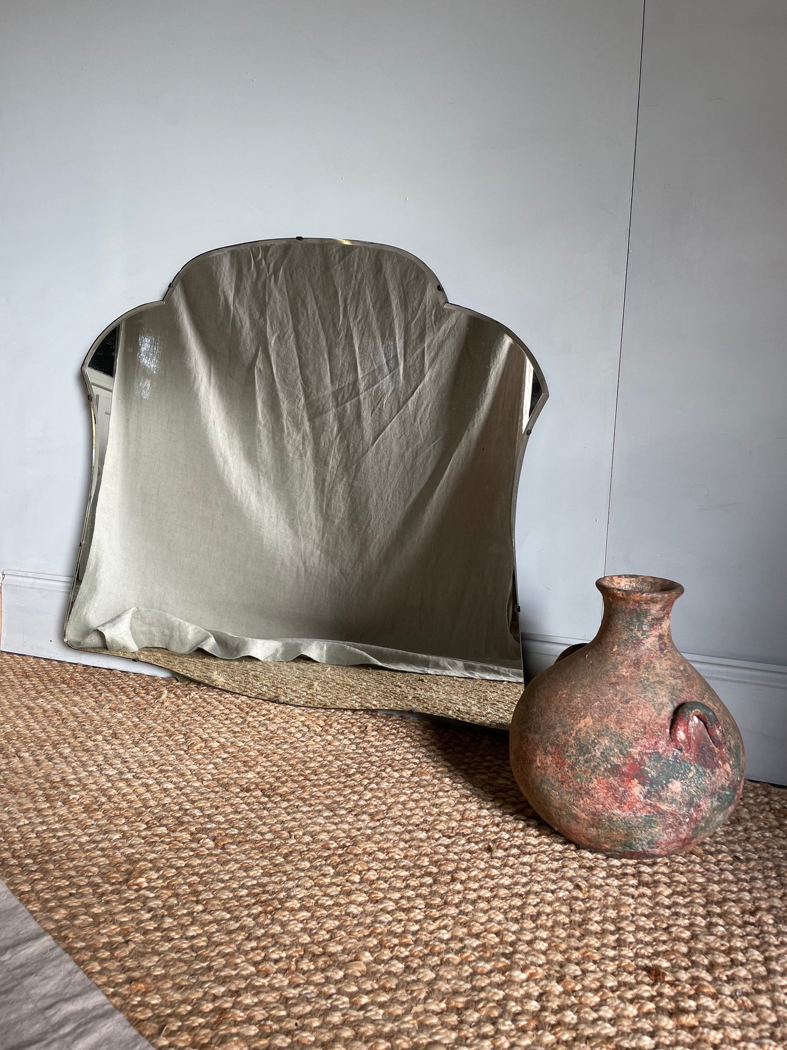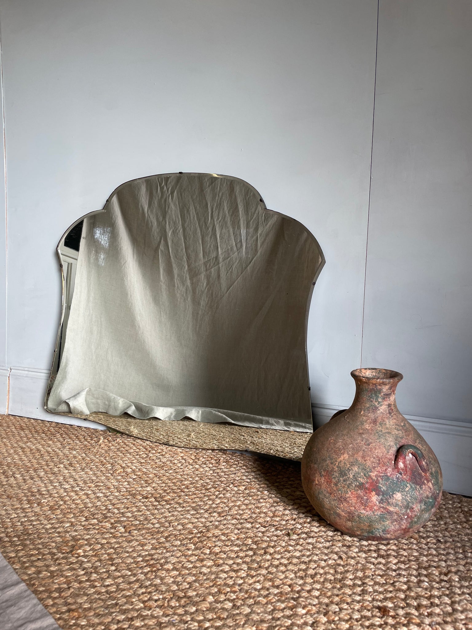 Large frameless art - deco mirror, teeny tiny chip bottom right as you look at it but hardly noticeable. It would look wonderful anywhere, bedroom, bathroom or hallway. The interesting shape but the lack of frame gives it a unique impact. It's such a good size it's the perfect instrument to bounce some light around a room without dominating it.