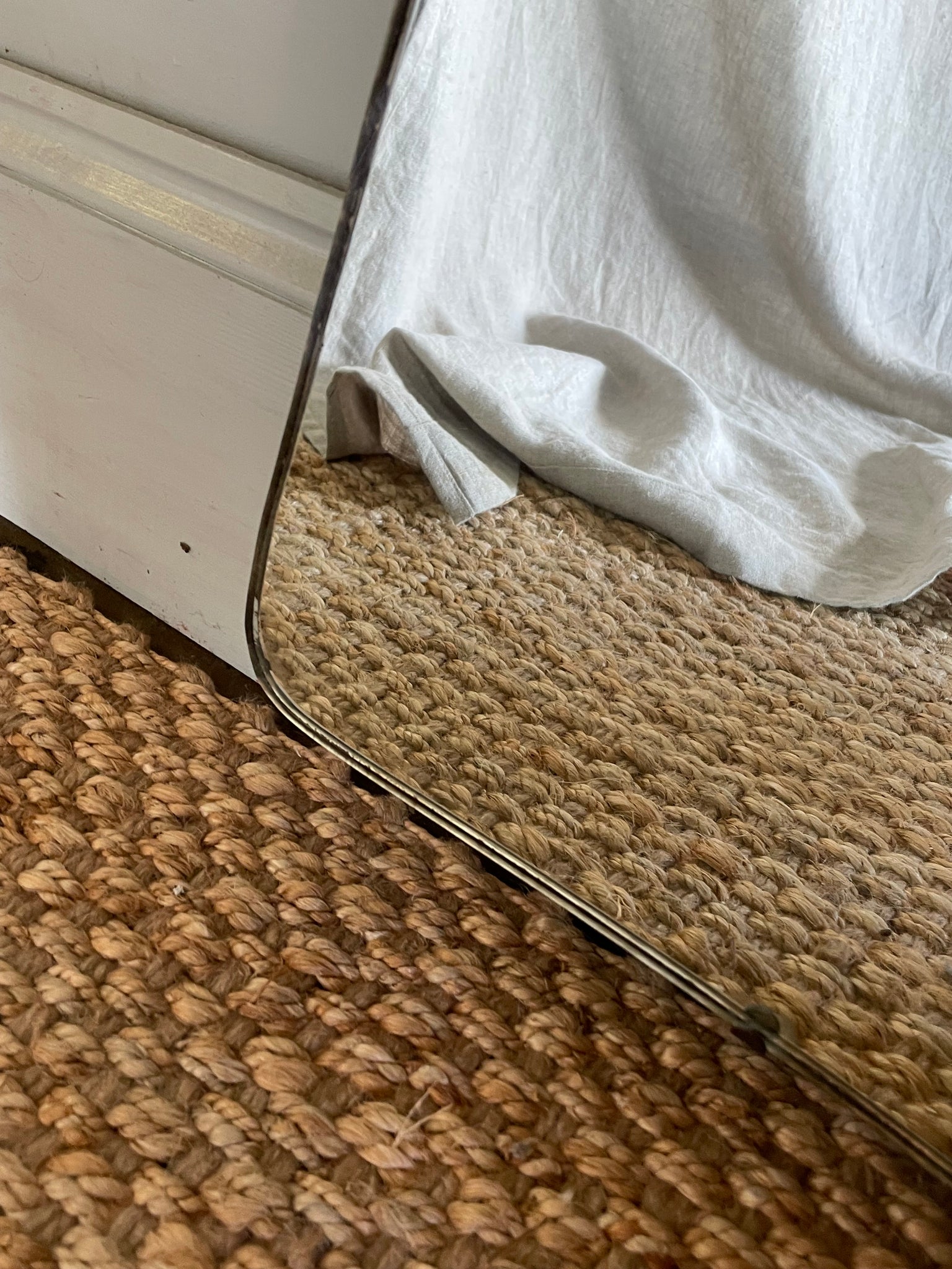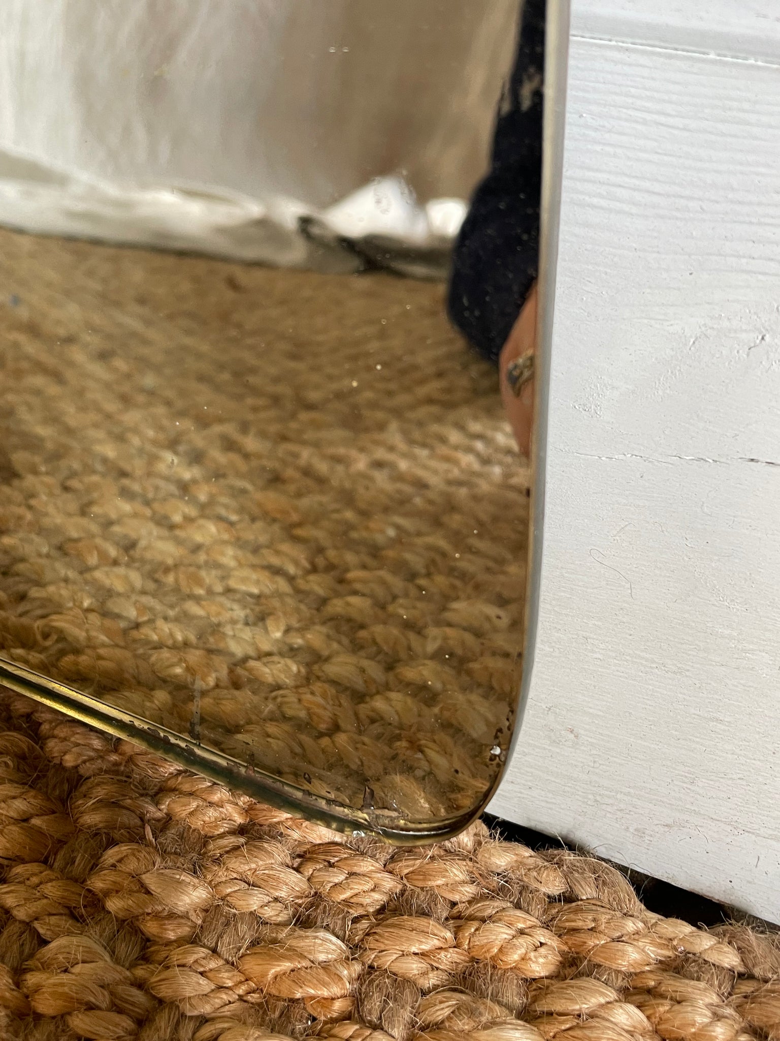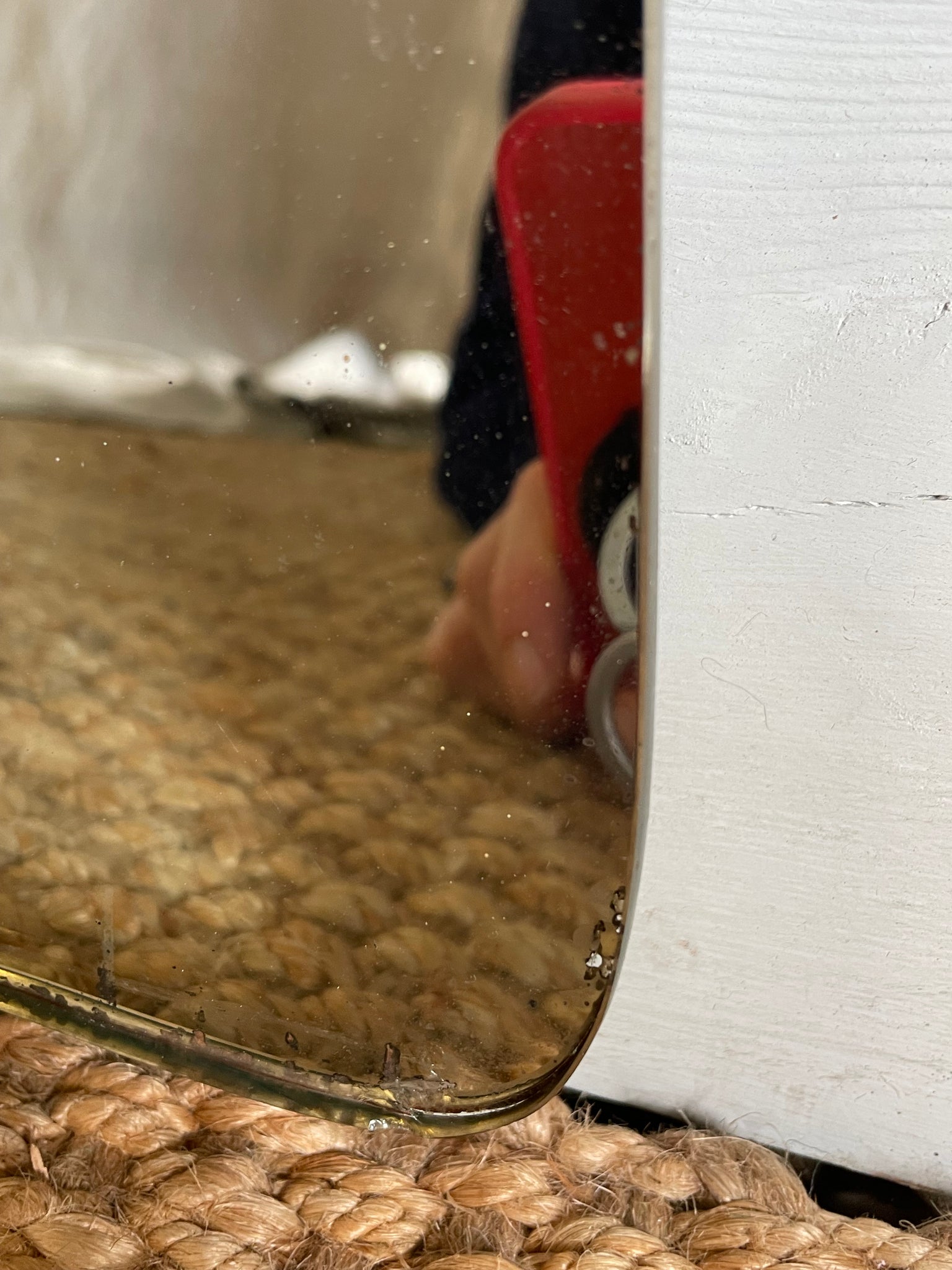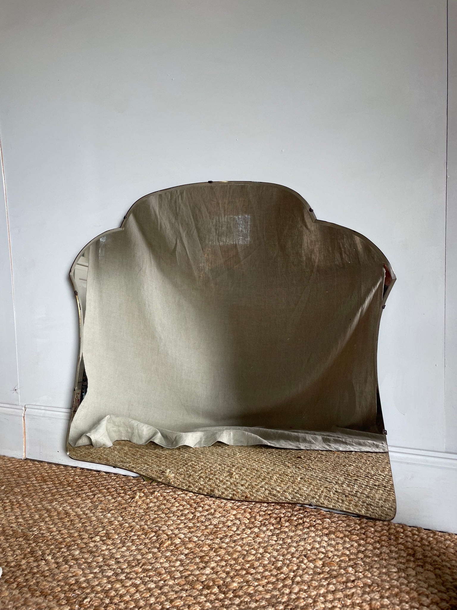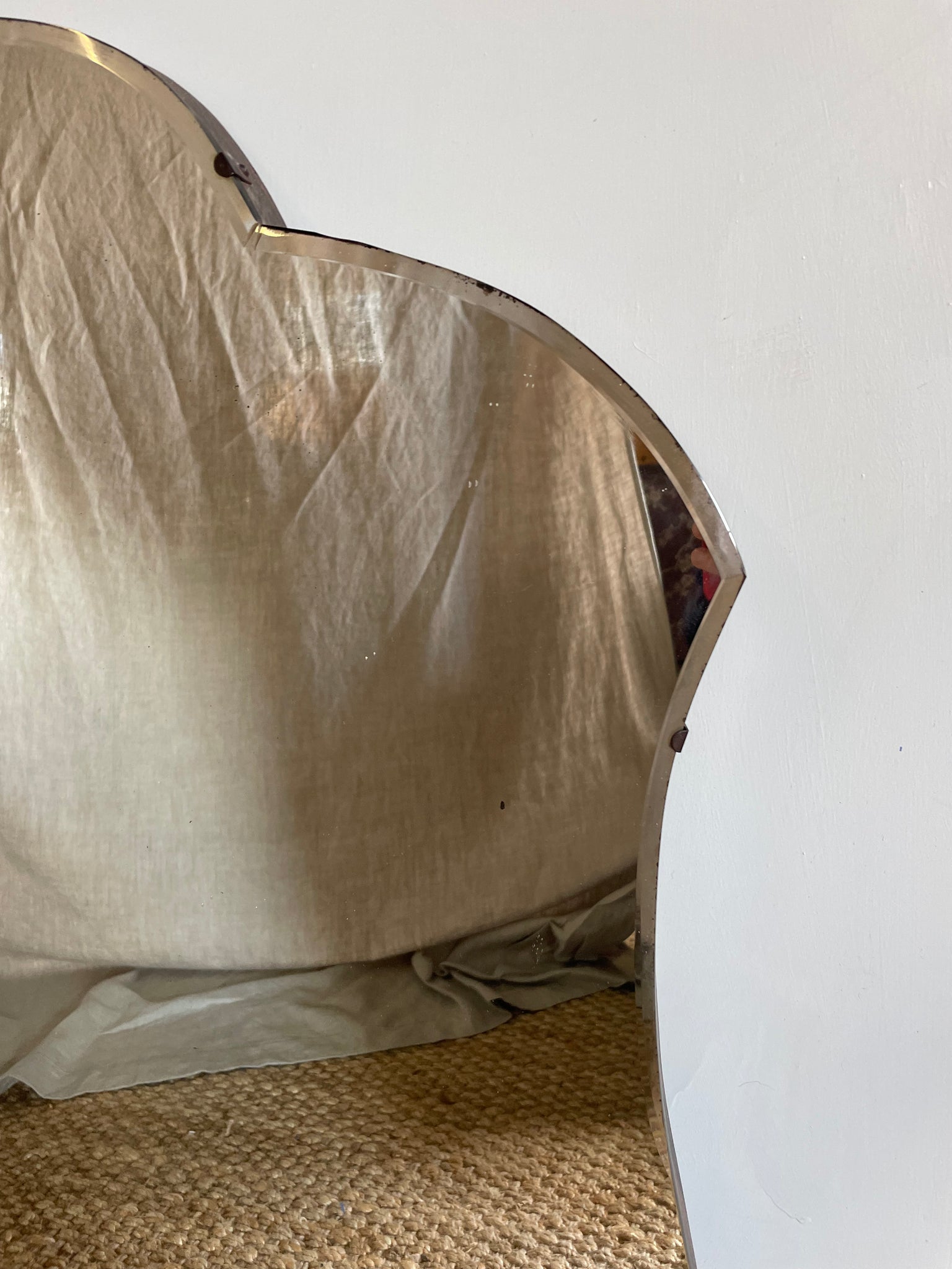 Large frameless art - deco mirror, teeny tiny chip bottom right as you look at it but hardly noticeable. It would look wonderful anywhere, bedroom, bathroom or hallway. The interesting shape but the lack of frame gives it a unique impact. It's such a good size it's the perfect instrument to bounce some light around a room without dominating it.