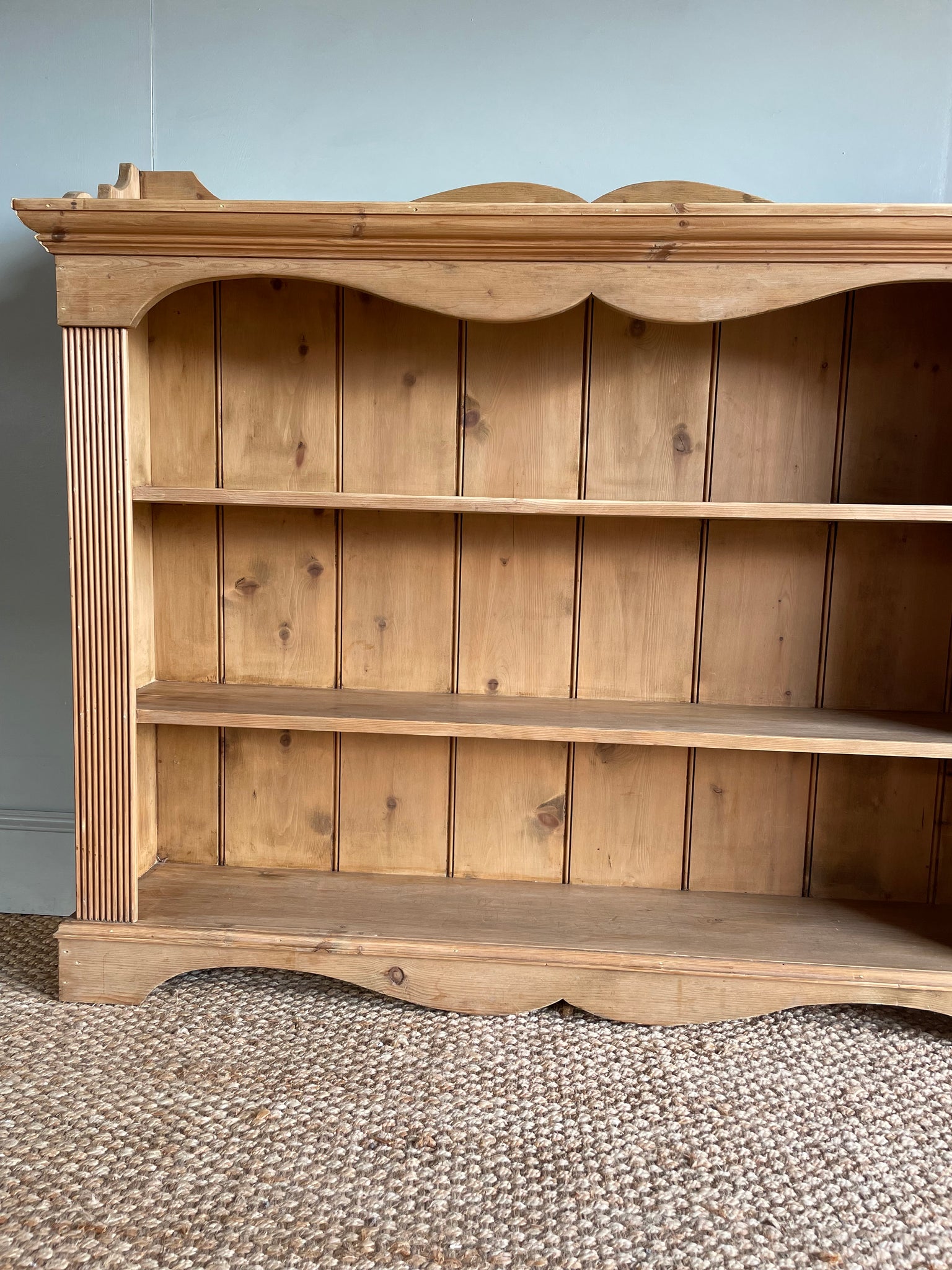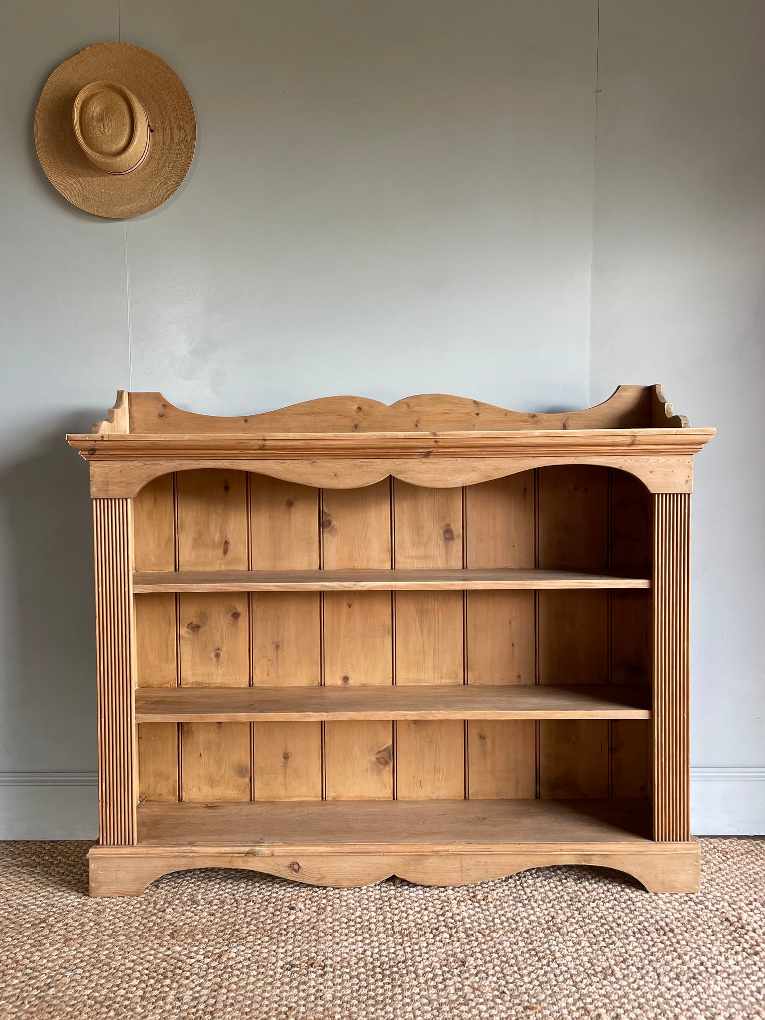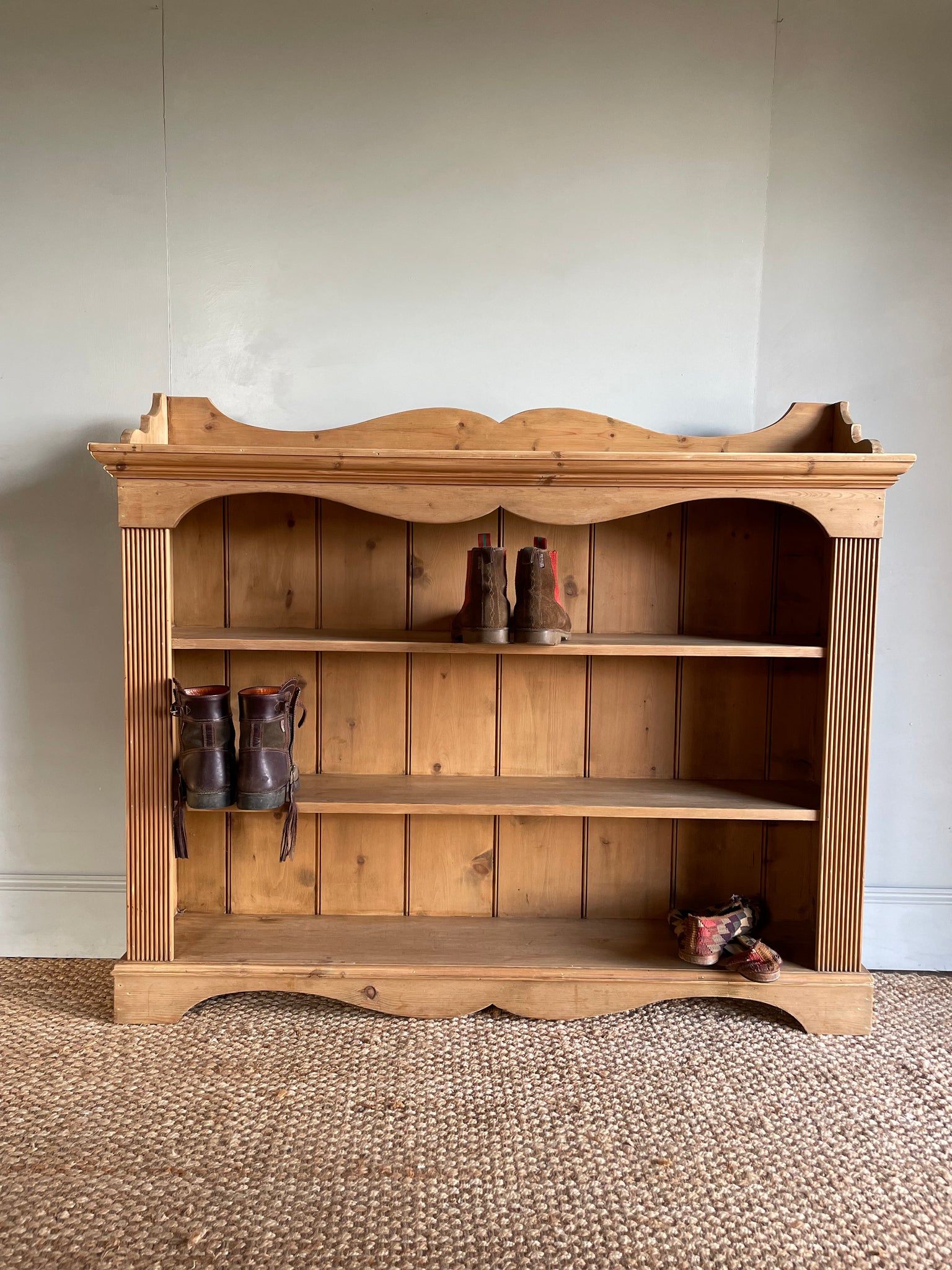 Striking large vintage pine book case, in the European manner. It would make a good boot rack or for general storage… would work well anywhere from a hallway or bootroom to bedroom.