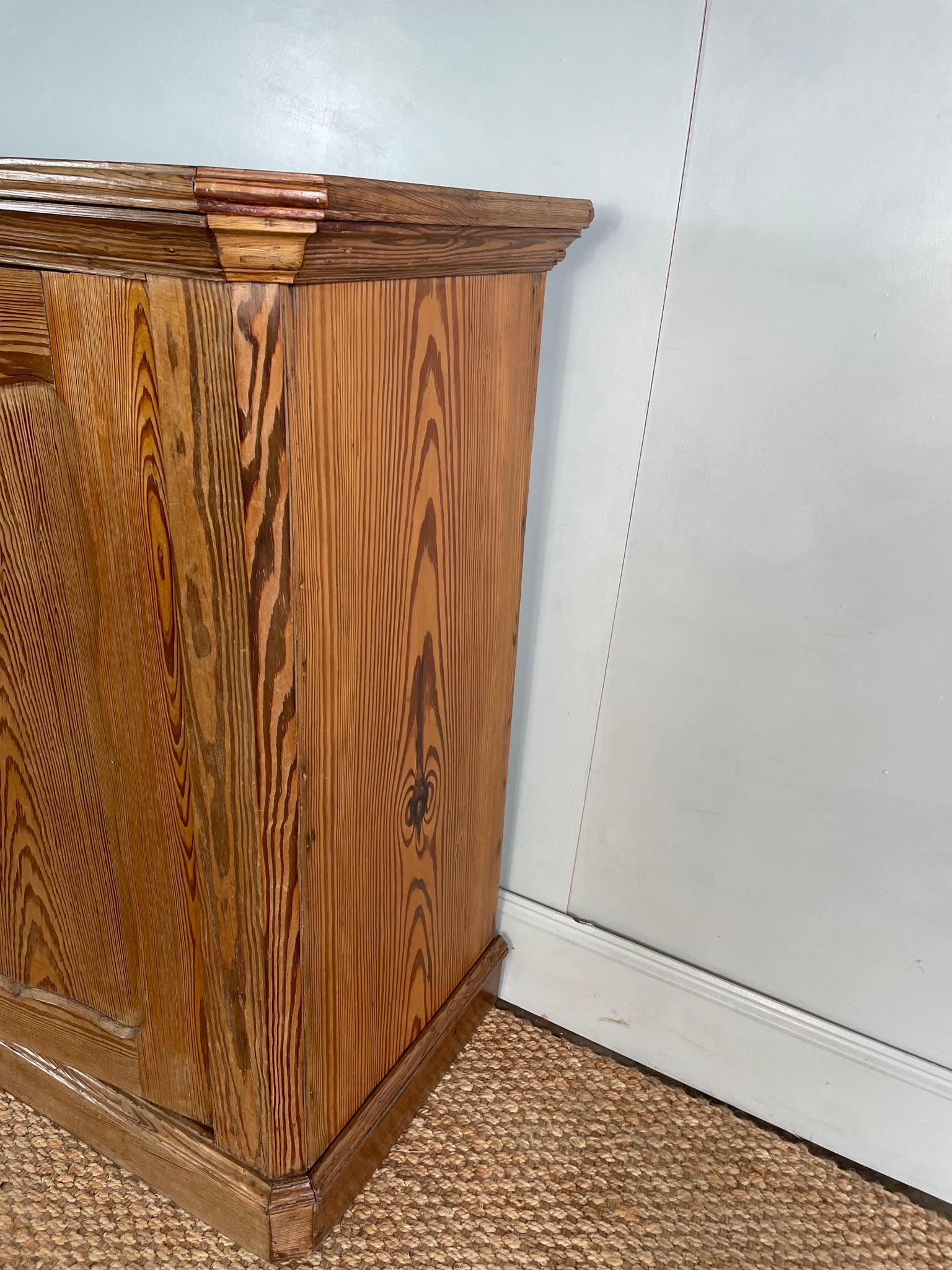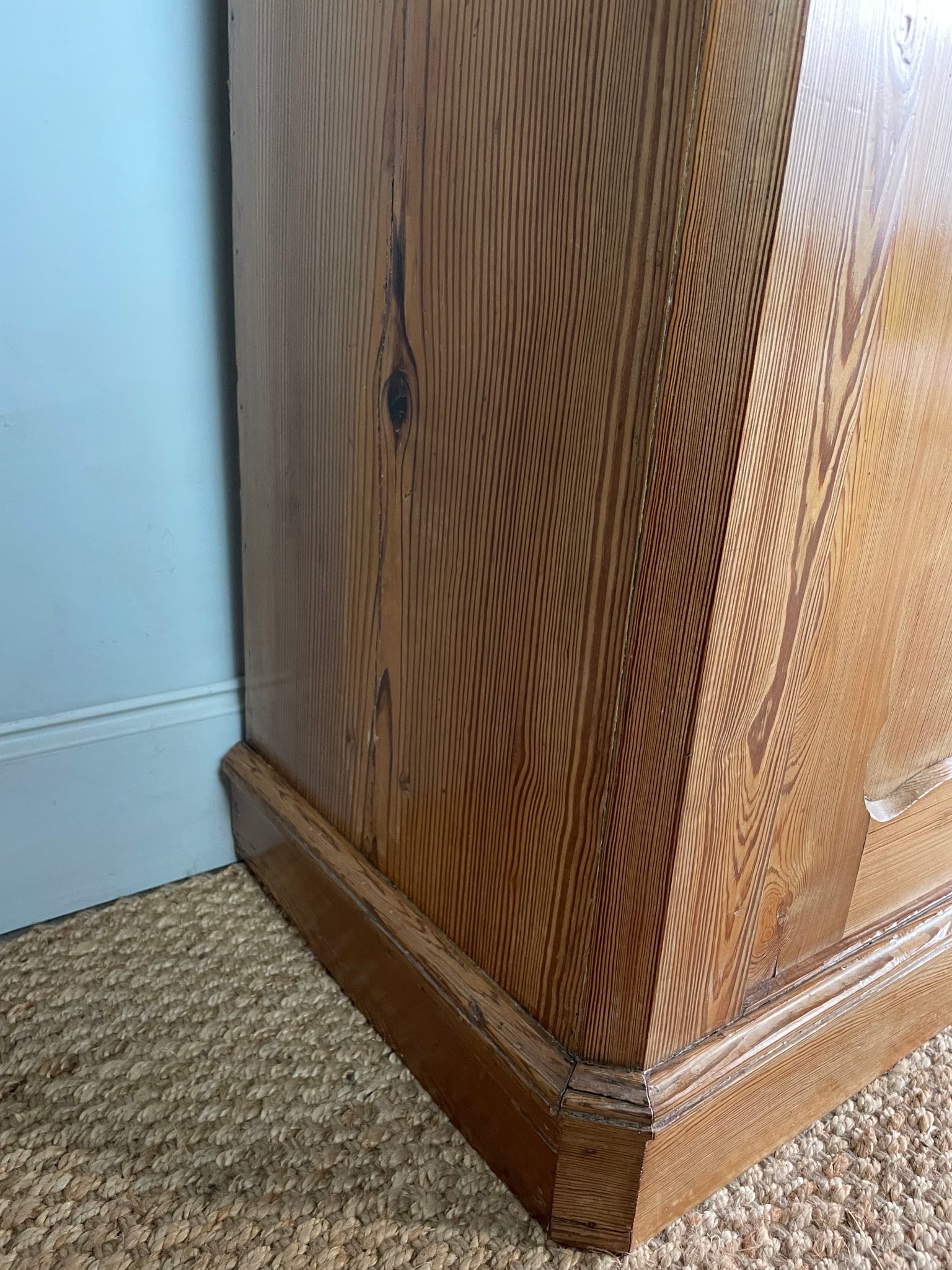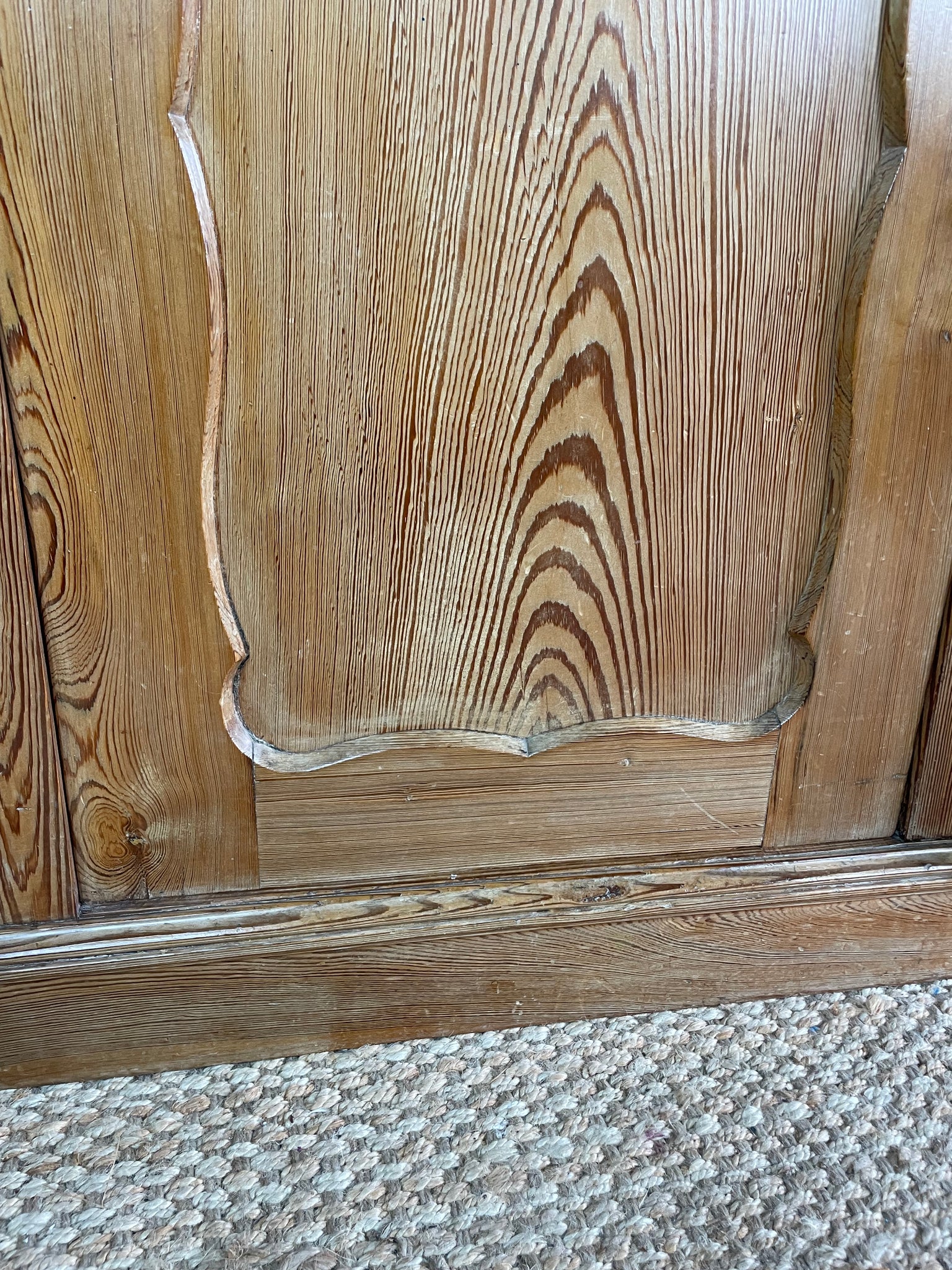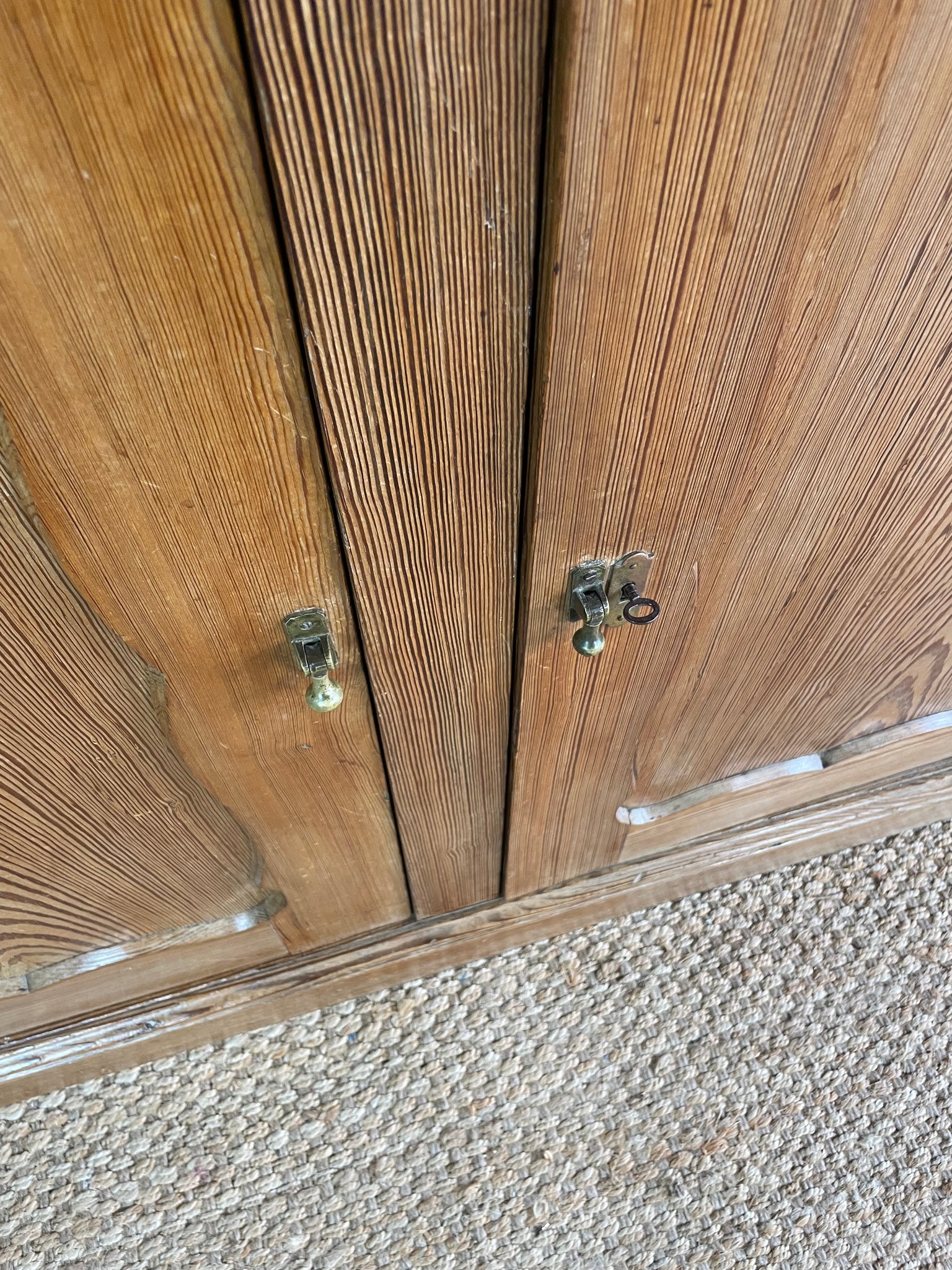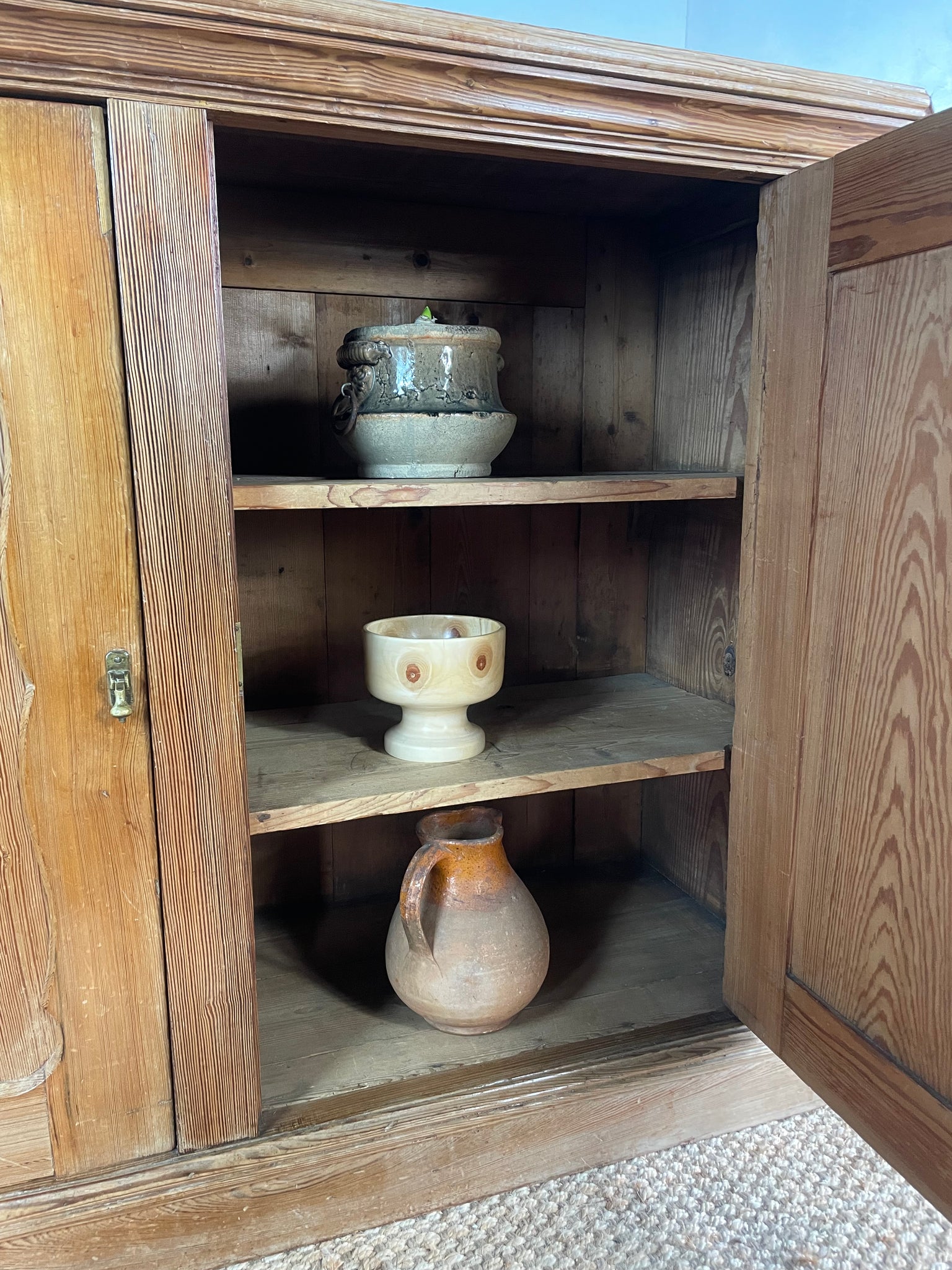Beautiful large antique pine French sideboard, with an wavy edged inserted panel. It’s very solid and has would be such a good workhorse anywhere in the home, hallway, bootroom, playroom, or even bedroom Lock works too, shelves are fixed.