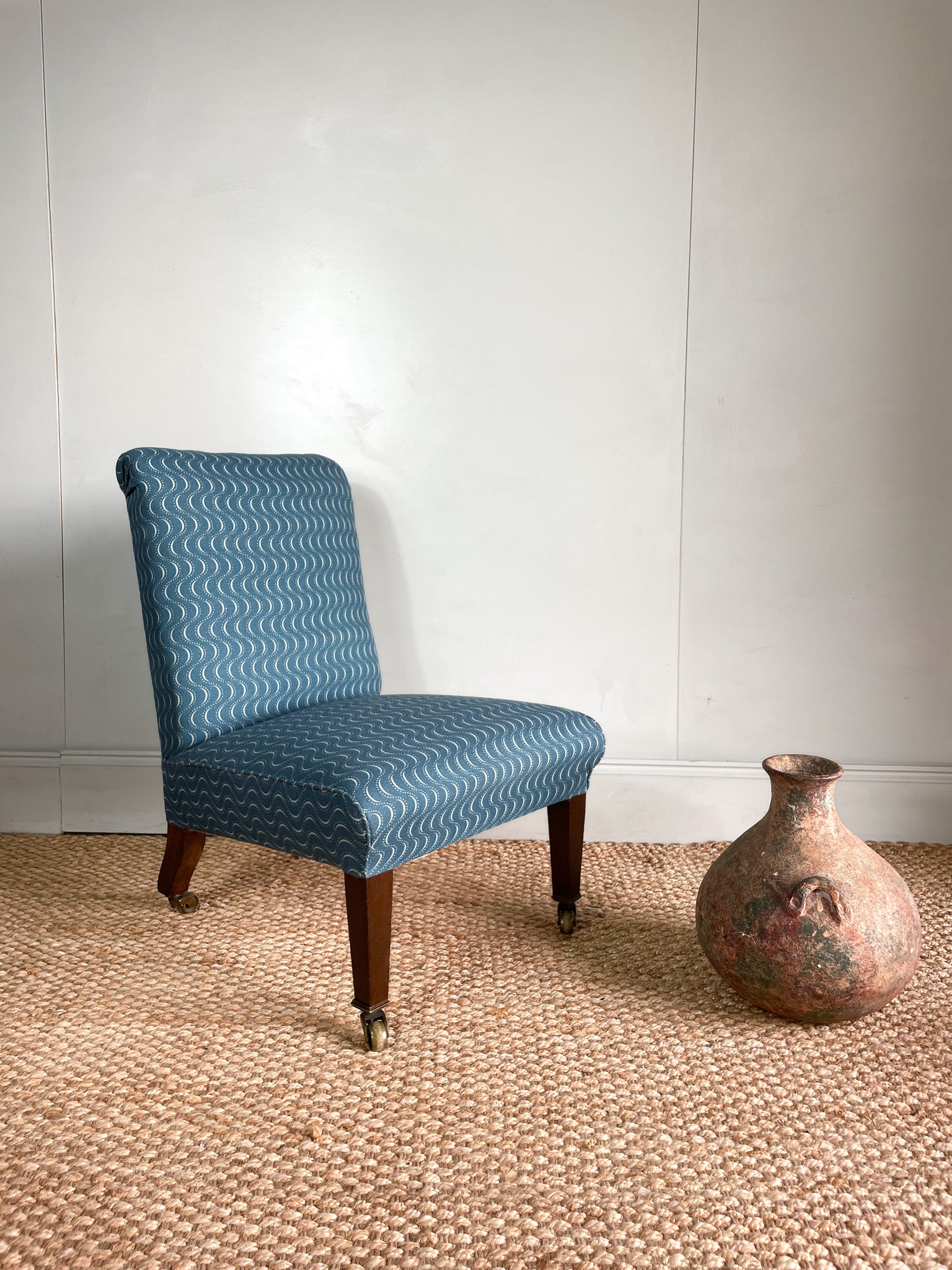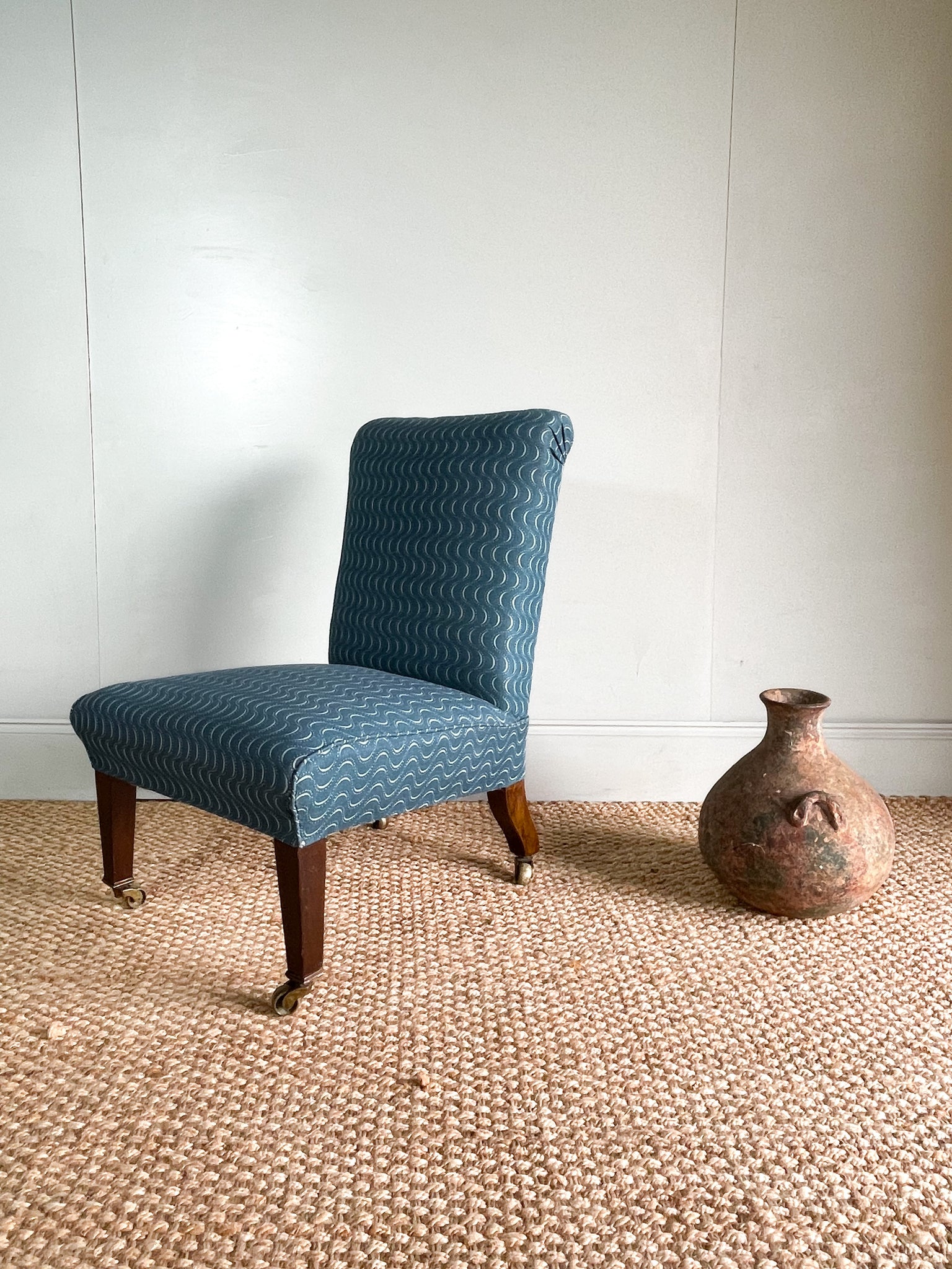 Unbelievably sweet little Victorian slipper chair. Newly upholstered in Vanderhurd’s Ondine, would be a super option for those looking for an antique bedroom chair or a little bathroom chair.